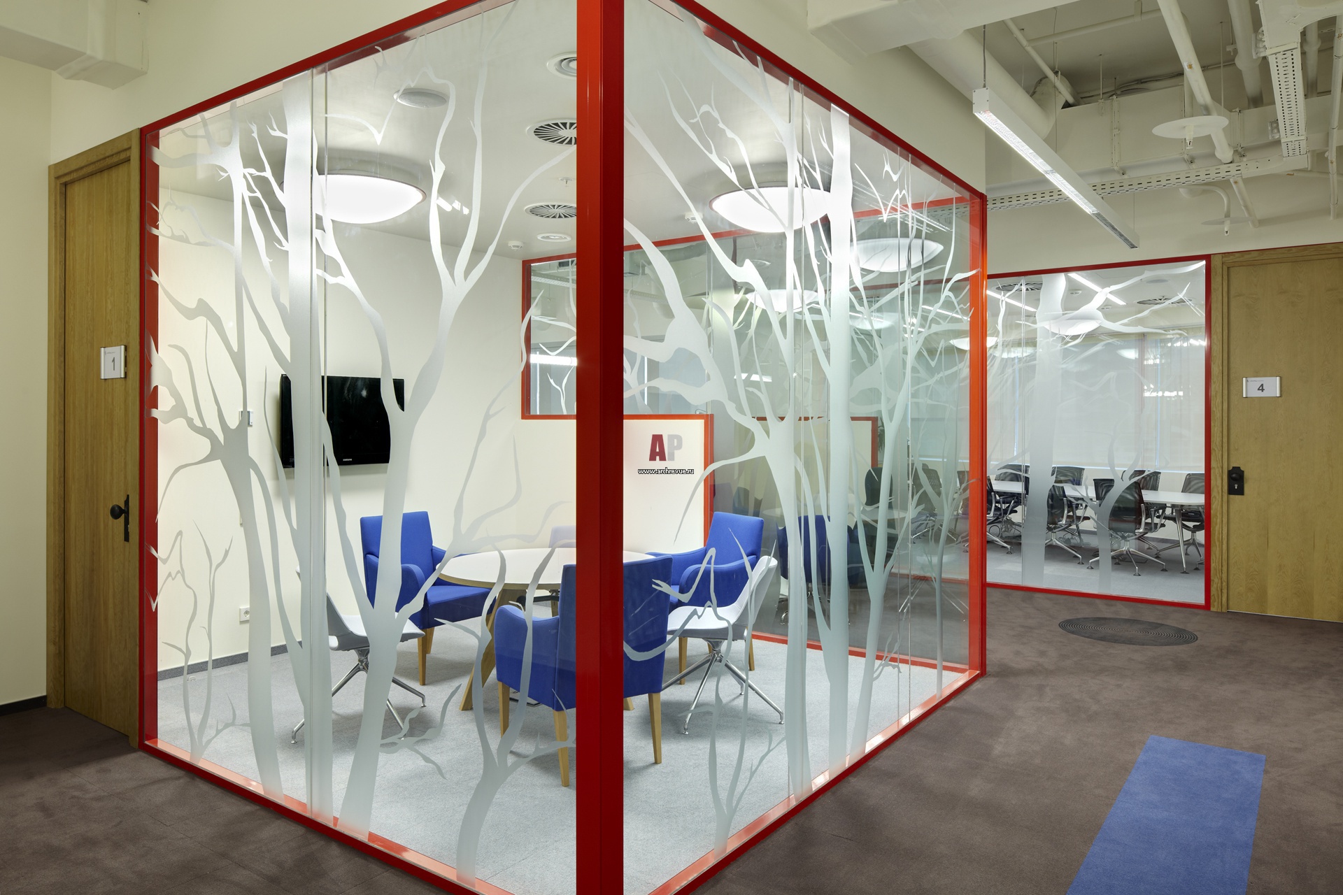 Фото интерьера малой переговорной. Прозрачные стеклянные панели, из которых сделаны стены, оформлены матовым рисунком с изображением стилизованного сказочного леса.