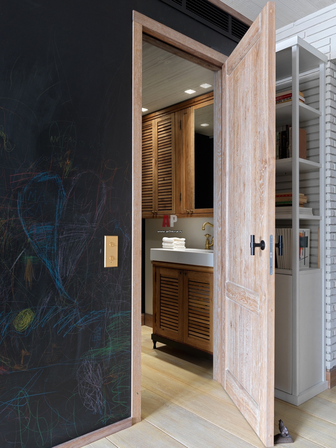 Детский санузел. Двери с эффектом старения сделаны на заказ. Слева – грифельная стена для рисования мелом. Электрофурнитура в стиле ретро, Meljac.