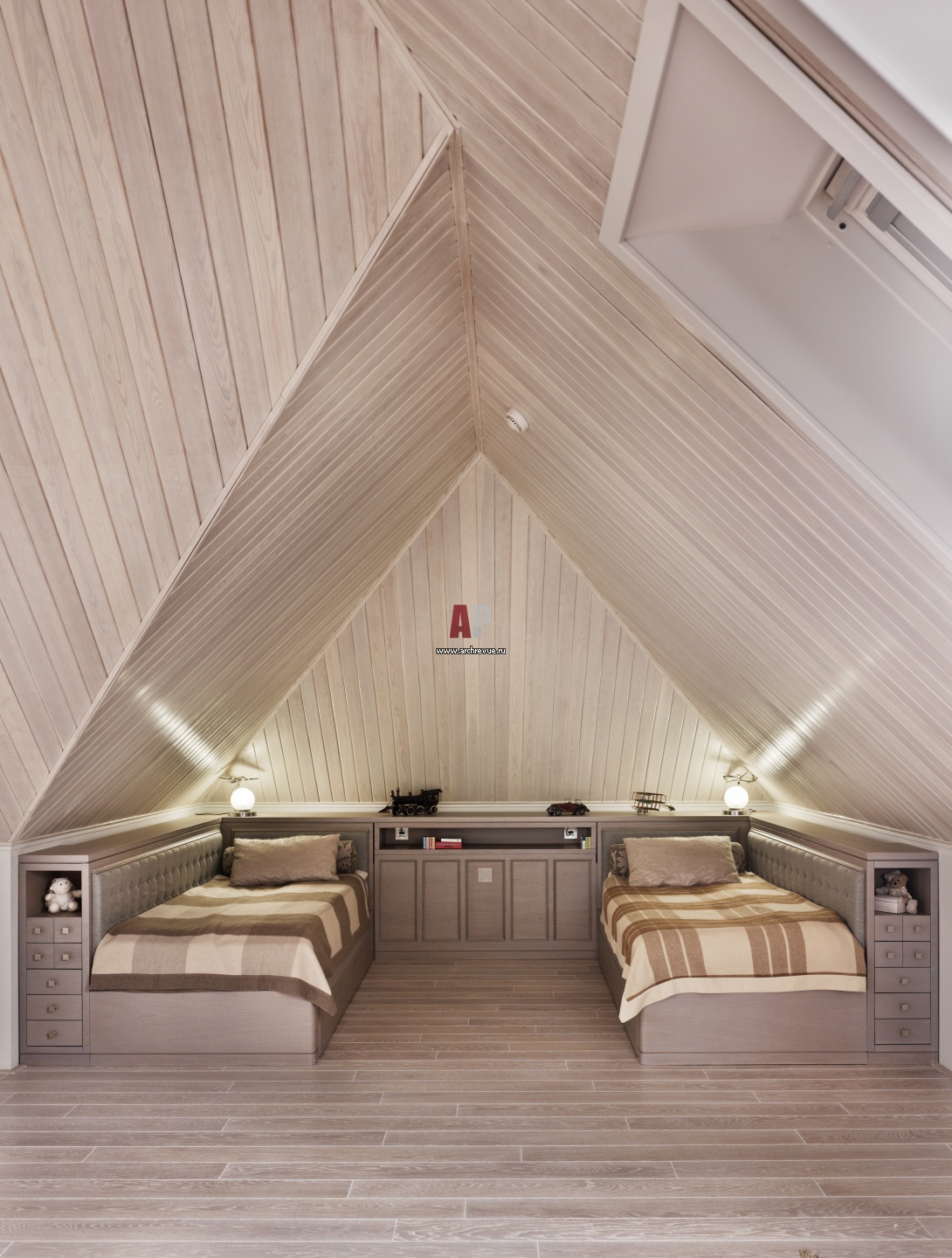 Спальная зона в распложенной в мансарде детской. Подшивка потолка, полы, встроенная мебельная группа выполнены из светлого дерева с похожей текстурой.