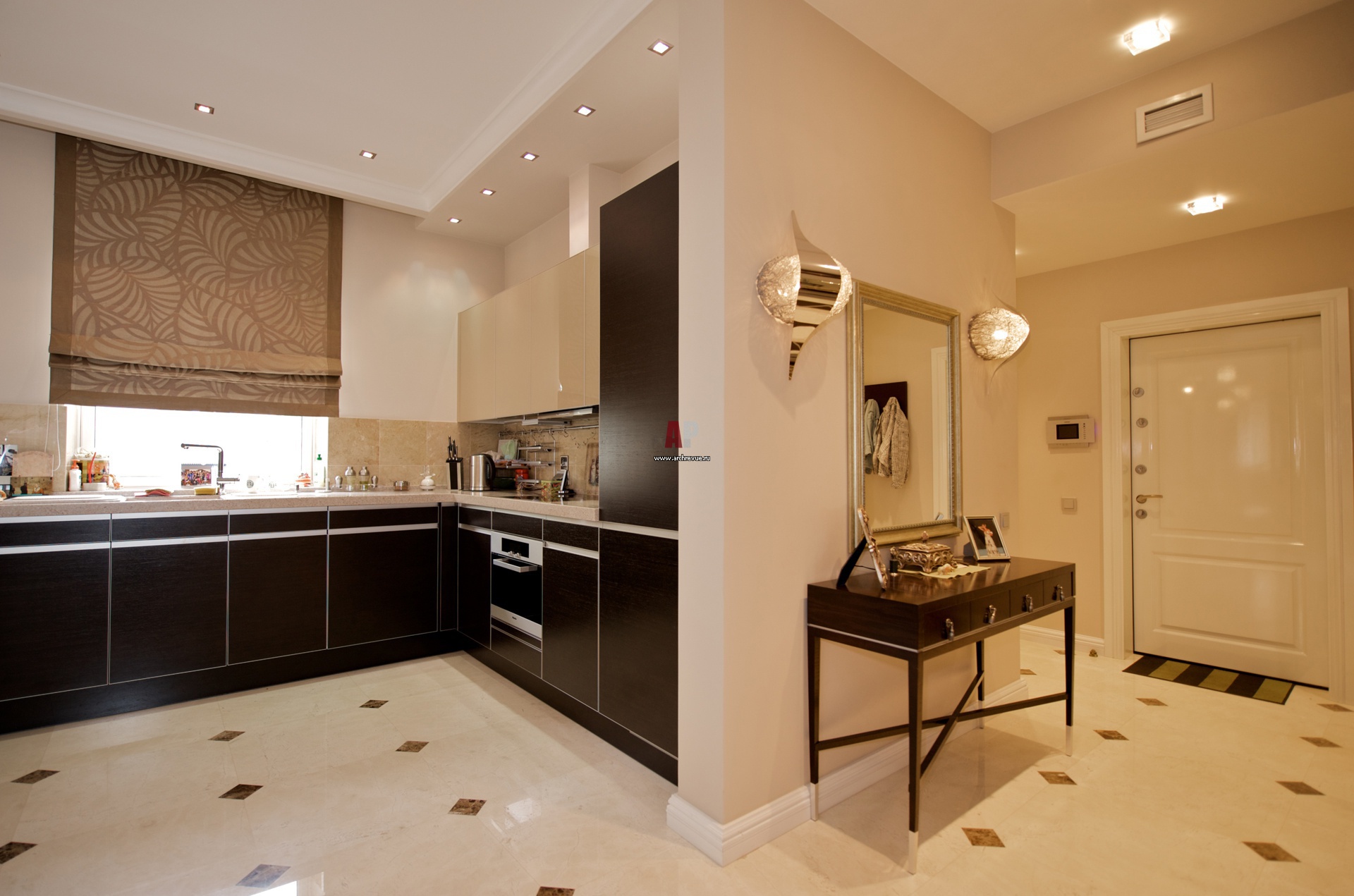 Прихожая, кухня и гостиная представляют собой единое пространство: просторное и светлое. Двери выполнены на заказ, поставщик «Ассоциация русских мастеров», полы выложены белым мрамором с фрагментами имперадора, поставщик «Новый интерьер». С натуральным мрамором гармонирует кориан, которым отделана столешница и барная стойка.