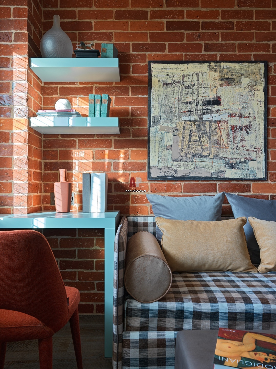 Гостевая спальня. Полки и стол сделаны на заказ, дерево покрыто известковой краской голубого цвета, Arte Di Vita.