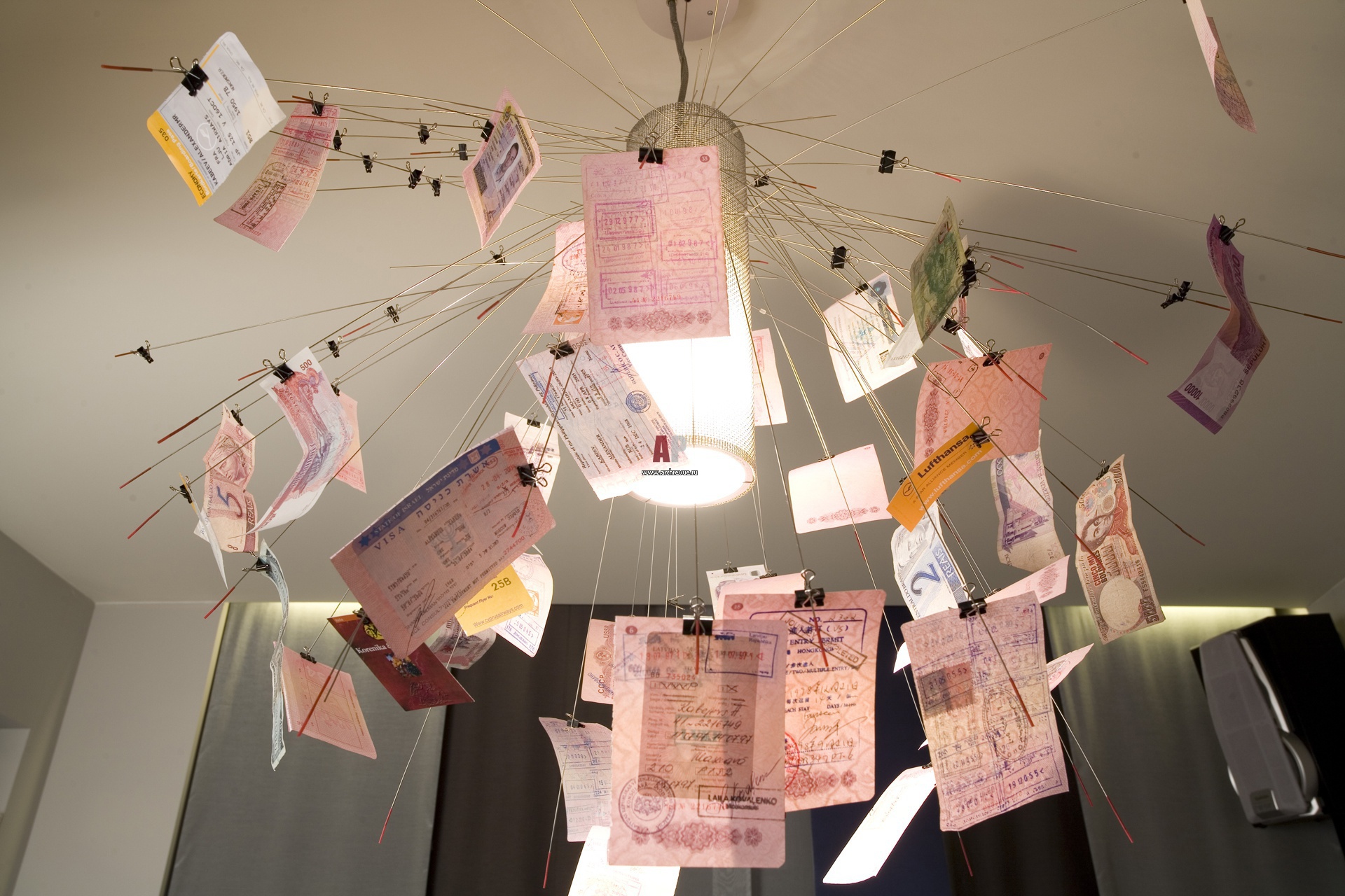 Светильник в комнате сына – модернизированная реплика известной дизайнерской люстры. Вместо обычных бумажек на тонких тросах развешены листочки, вырванные из старых загранпаспортов, и купюры тех стран, где семья путешествовала.