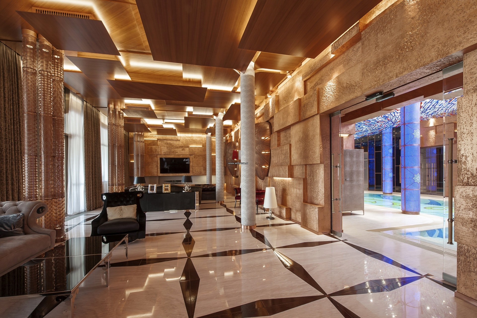 Игру объемов и фактур усиливает световое оформление: световые ленты, пропущенные сквозь резные поверхности, вмонтированные внутрь металлических и каменных колонн, а также струящиеся сквозь прорези в потолочных панелях.