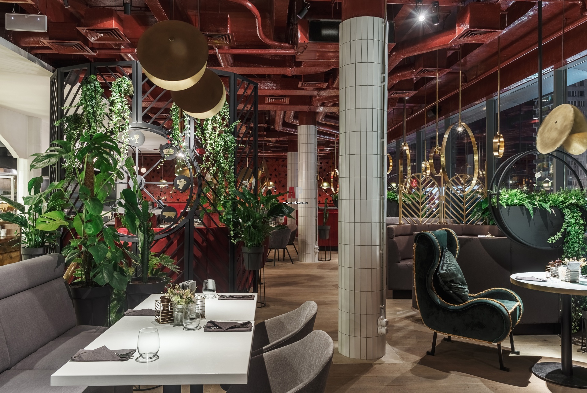 Интерьер ресторана «Пирог мясника» в насыщенных бордовых тонах. По контрасту со стенами и потолком несущие колонны облицованы белой глянцевой керамической плиткой CE.SI, коллекция Metro.