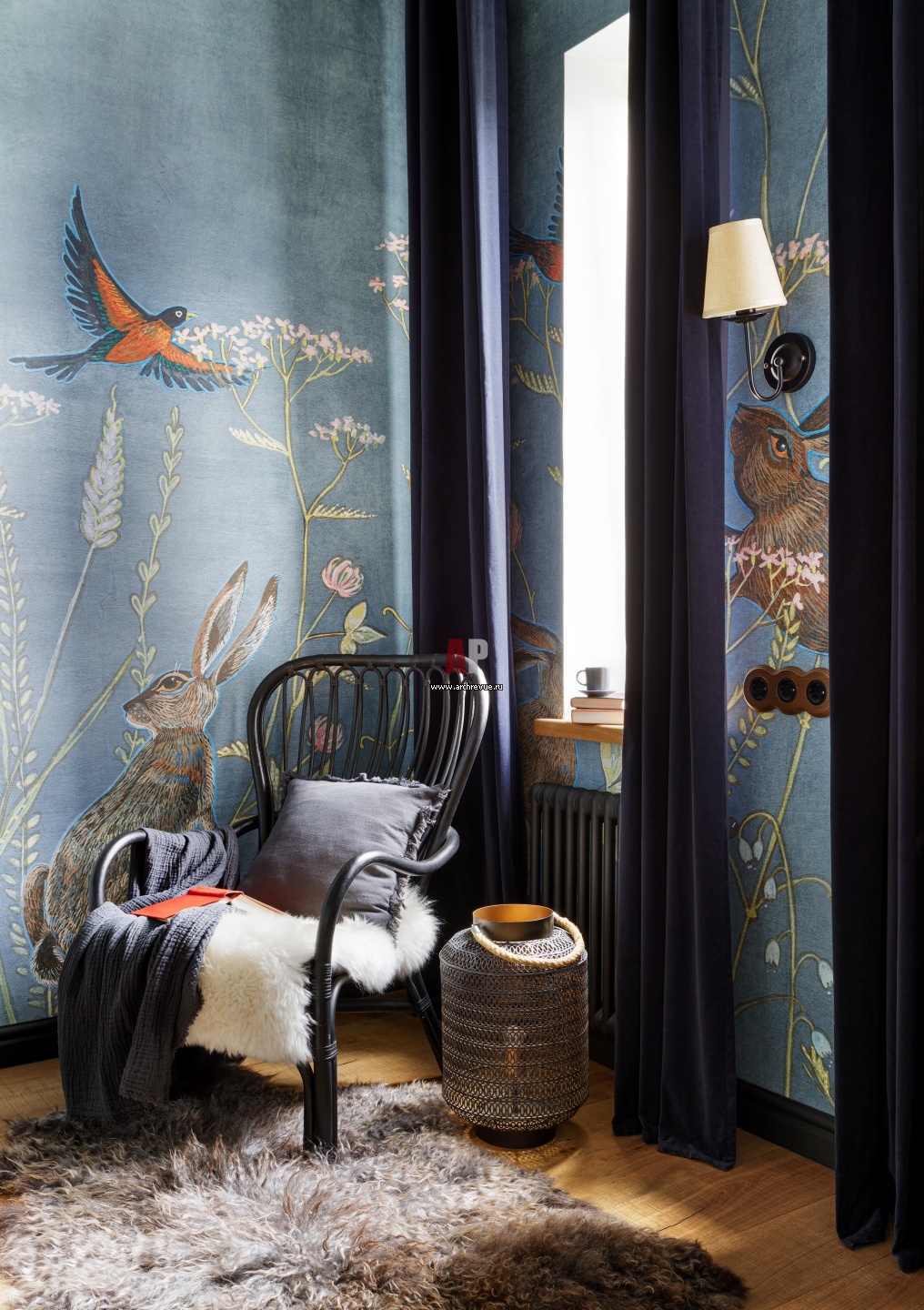 Эклектичное шале у реки. Голубая гостевая спальня на первом этаже.