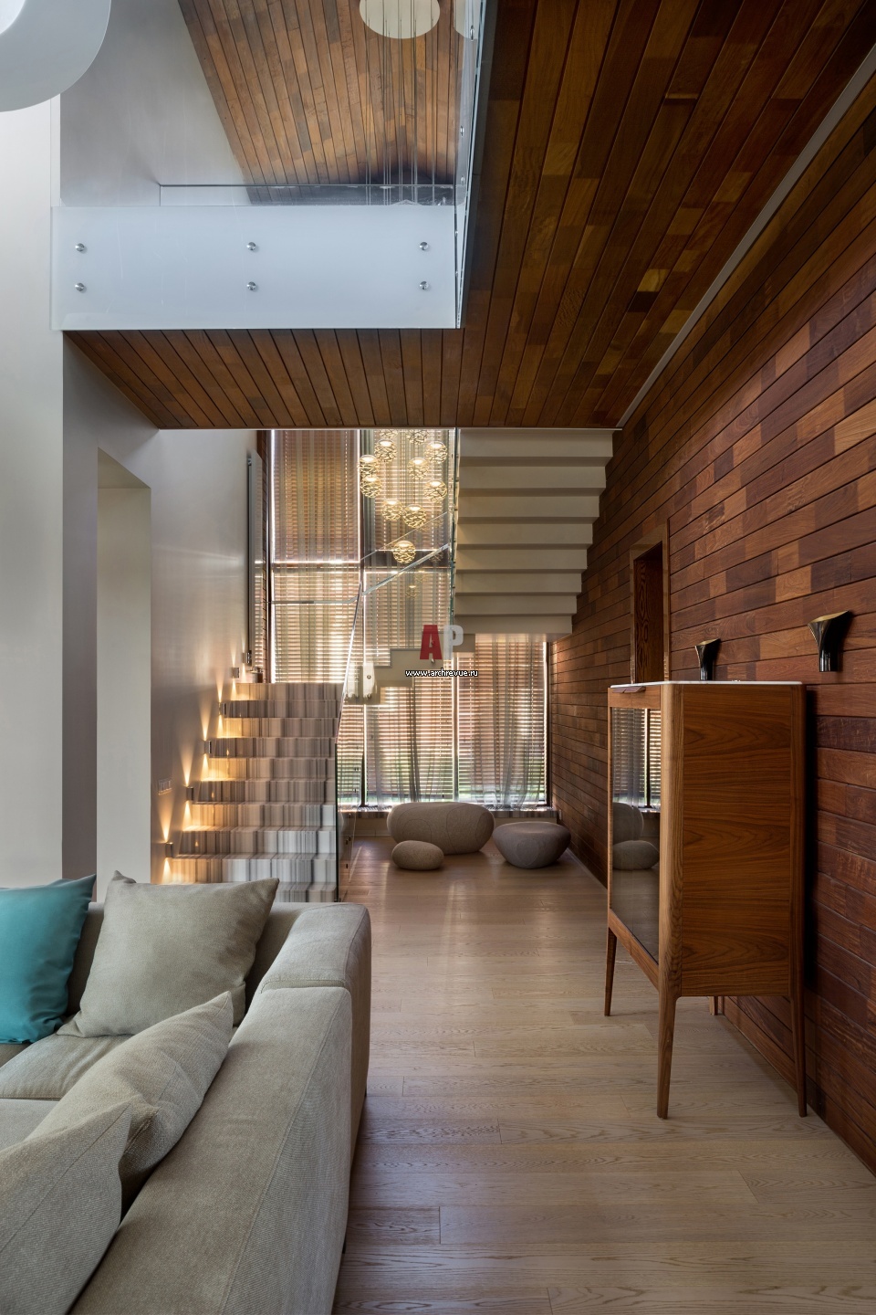 Лестничный холл со стеклянной лестницей и балкон второго этажа также включены в общее пространство, отчего гостевой объем выглядит еще большее просторным и проницаемым.