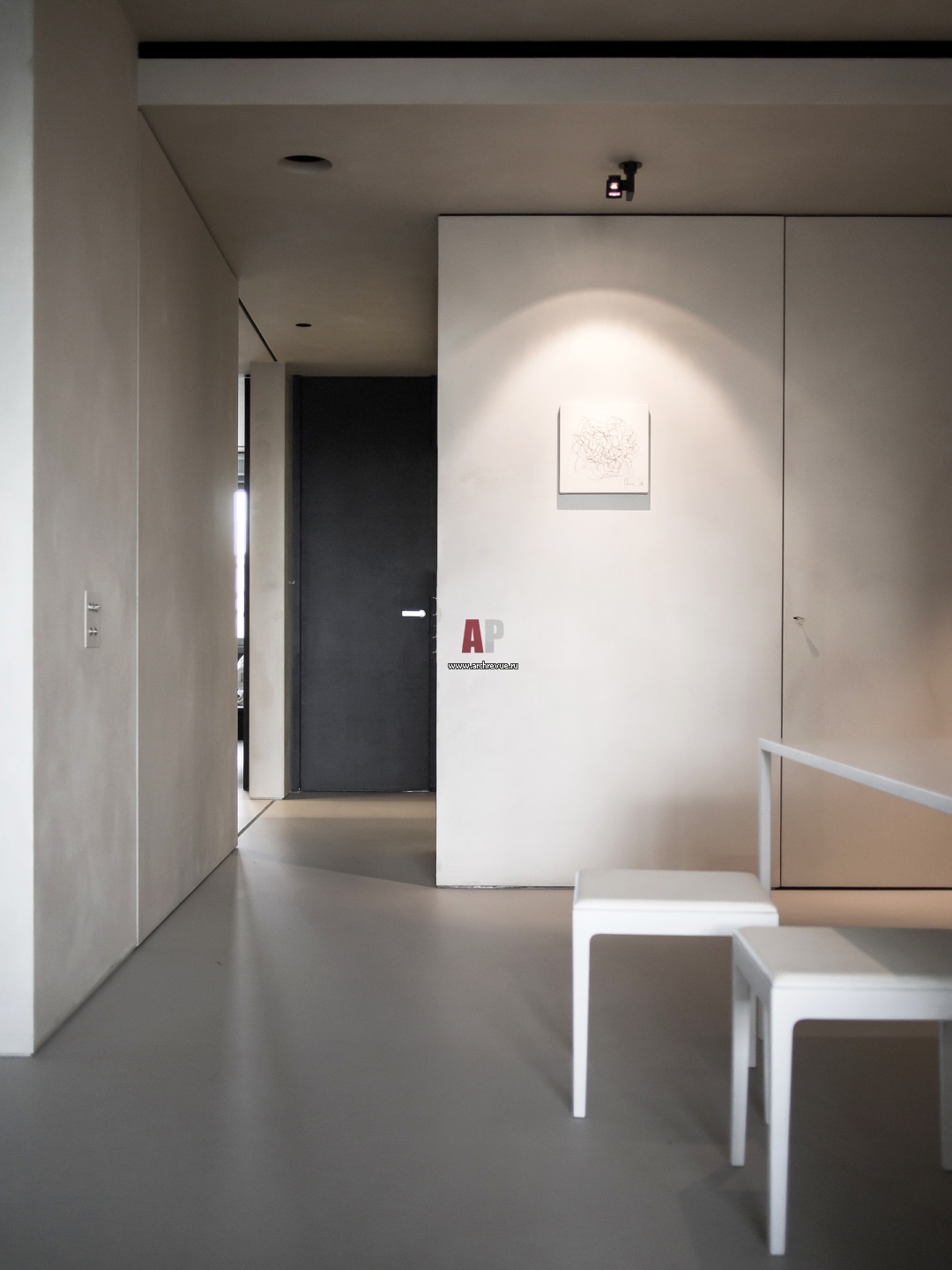 Интерьер общей зоны квартиры в стиле минимализм. Стены и потолки во всех помещениях решены в единой отделке под бетон. Полы – наливной бетон. Черно-белая абстрактная графика на стенах работы современного испанского художника.