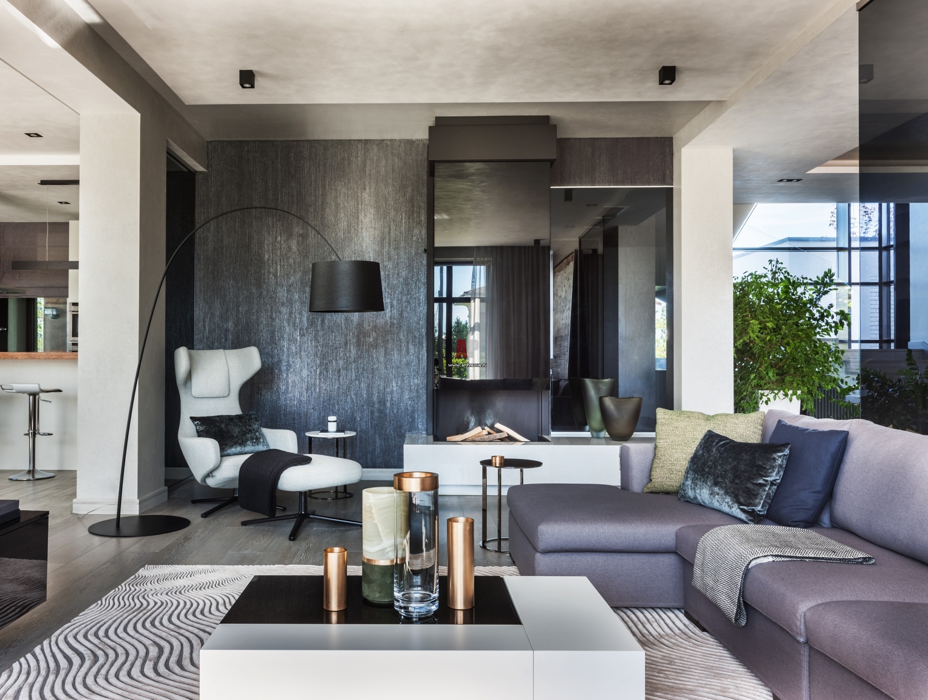 По центру первого этажа расположен кубический объем, в который встроен камин и мокрая зона с гостевым санузлом. Камин из черного стекла и примыкающая к нему стена, отделанная на контрасте с общим фоном, видны из всех зон: прихожей, кухни-столовой, гостиной.