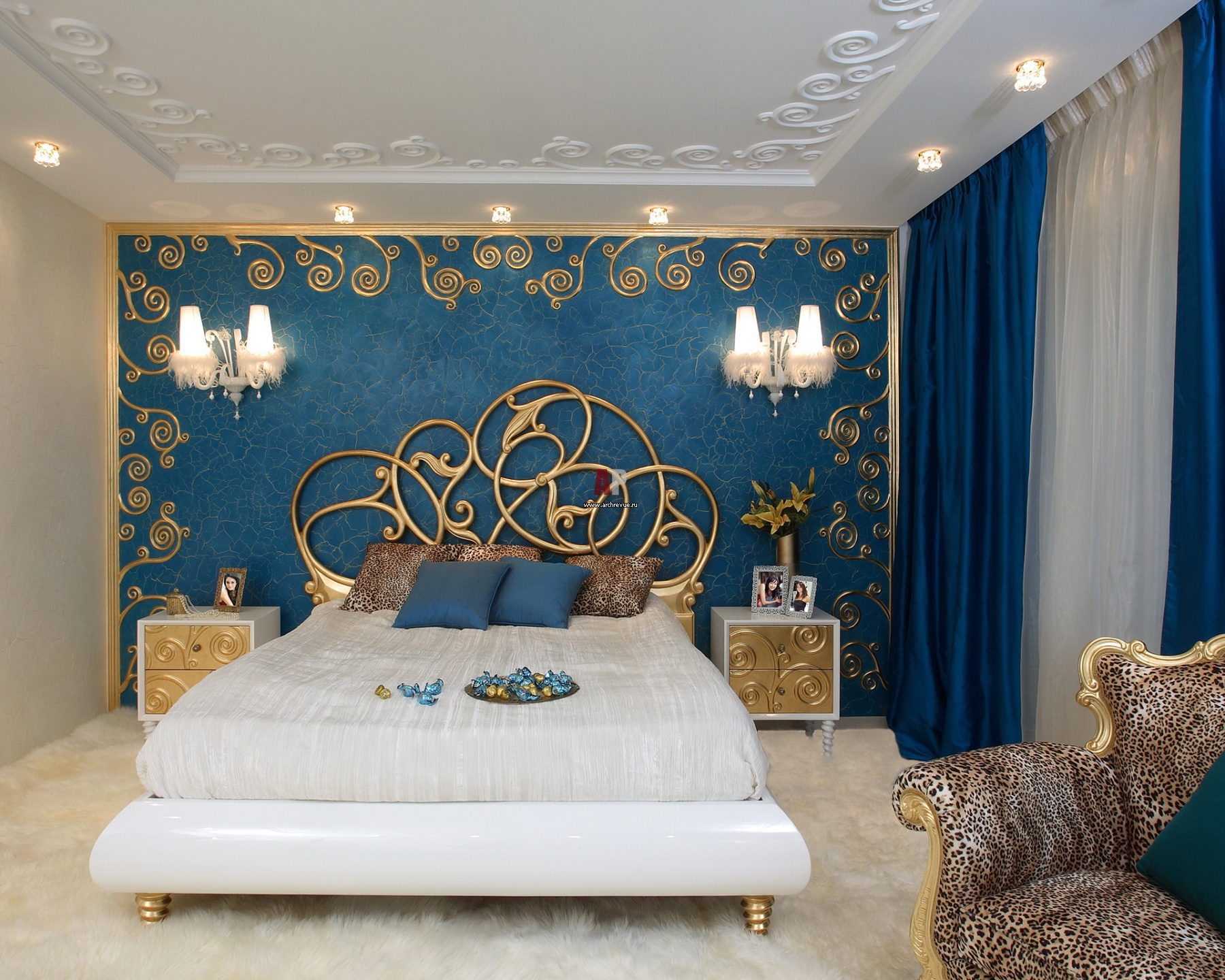 Фото интерьера женской спальни с элементами стиля гламур и необарокко. Стена за изголовьем кровати оформлена декоративными покрасками с золотыми трещинками на ярко-голубом фоне, использованы декоративные покрытия Sikkens, поставщик «Дом Краски / Деко – Эм». По периметру стена украшена золотыми лепными завитками, форма и характер которых рифмуется с пышной барочной спинкой кровати Zanotta.