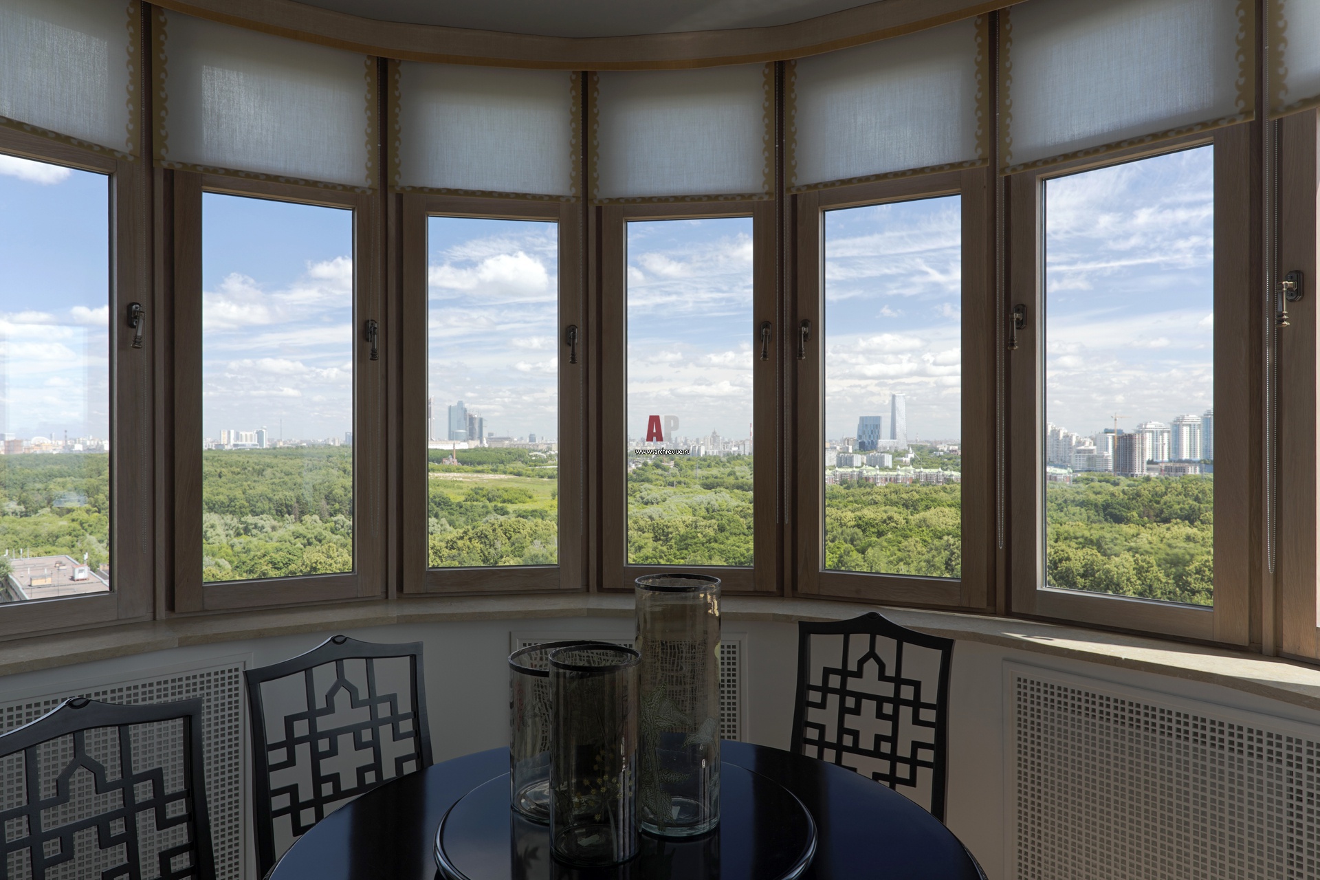 Столовая группа расположена у полукруглого окна на месте присоединенной лоджии. Немецкие алюминиево-деревянные стеклопакеты снаружи выполнены из белого пластика и не нарушают единый облик фасадов, внутри – из дерева. Чтобы добиться идеального совпадения оттенков рамы и паркета, дизайнеры отправляли образец паркета на фабрику окон. Полукруглое эркерное окно декорировано рольф-ставнями с орнаментом.