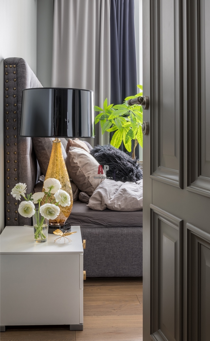 Интерьер спальни, как и остальные помещения квартиры, выполнен в сложных серых тонах.
