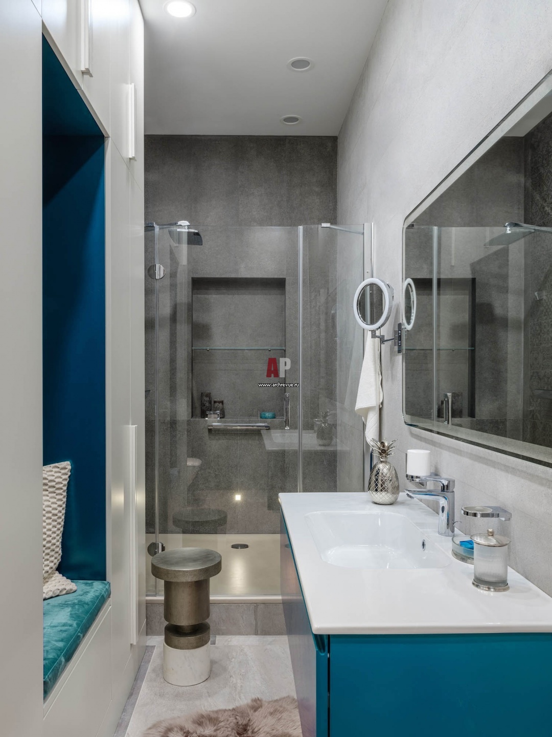 Дизайнера объединили раздельный санузел в удобную ванную комнату. Напротив умывальника спроектирована система хранения с нишей для переодевания. За панелями скрыты стиральная и сушильная машины, бойлер и бытовая химия.