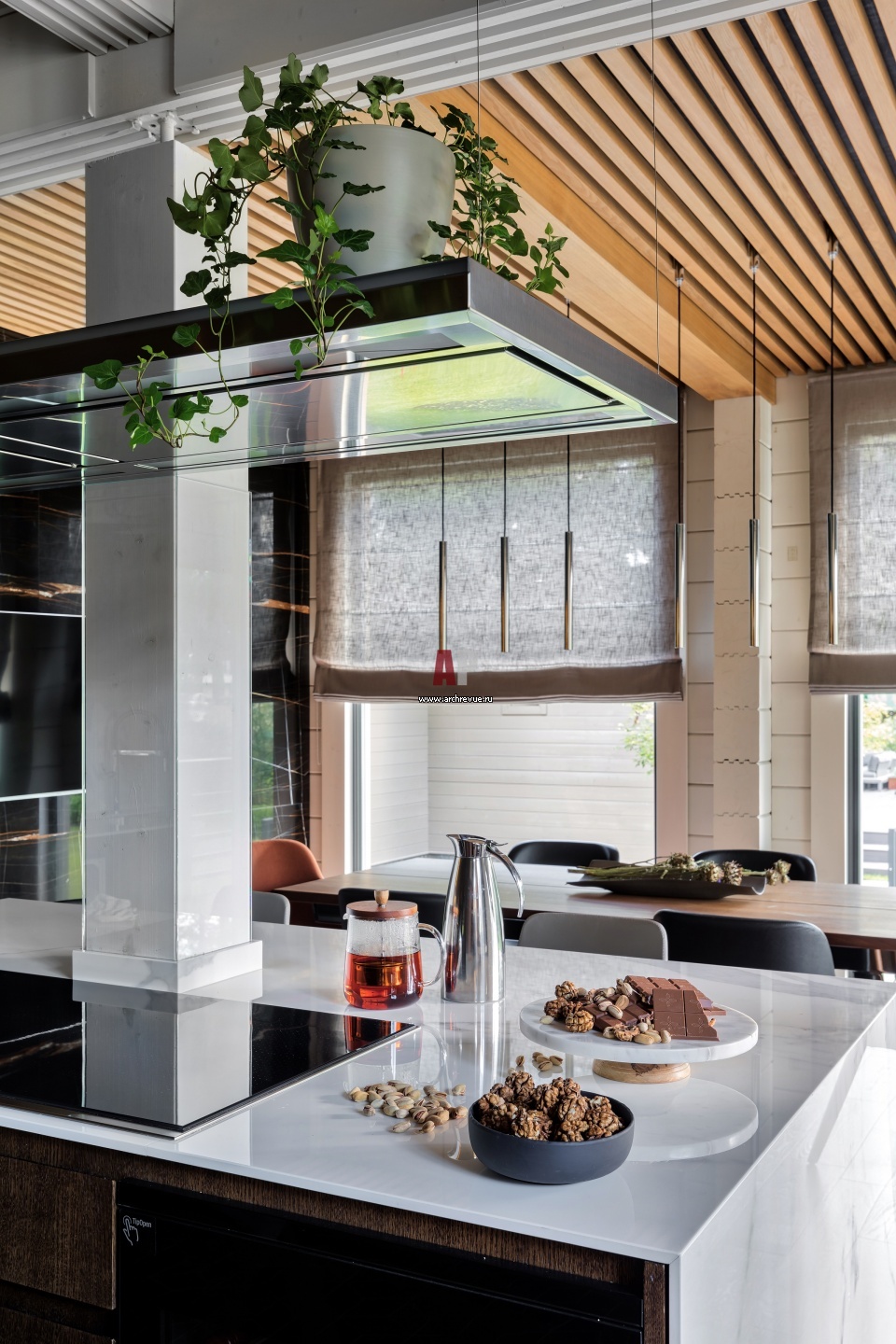 Зона кухни с островом. Вытяжка Falmec парит над рабочей поверхностью.