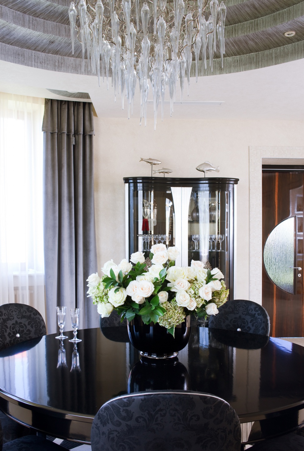 Фрагмент интерьера столовой в стиле ар-деко. Круглый обеденный стол, Oak. Многоуровневый круглый потолок декорирован сусальным серебром.
