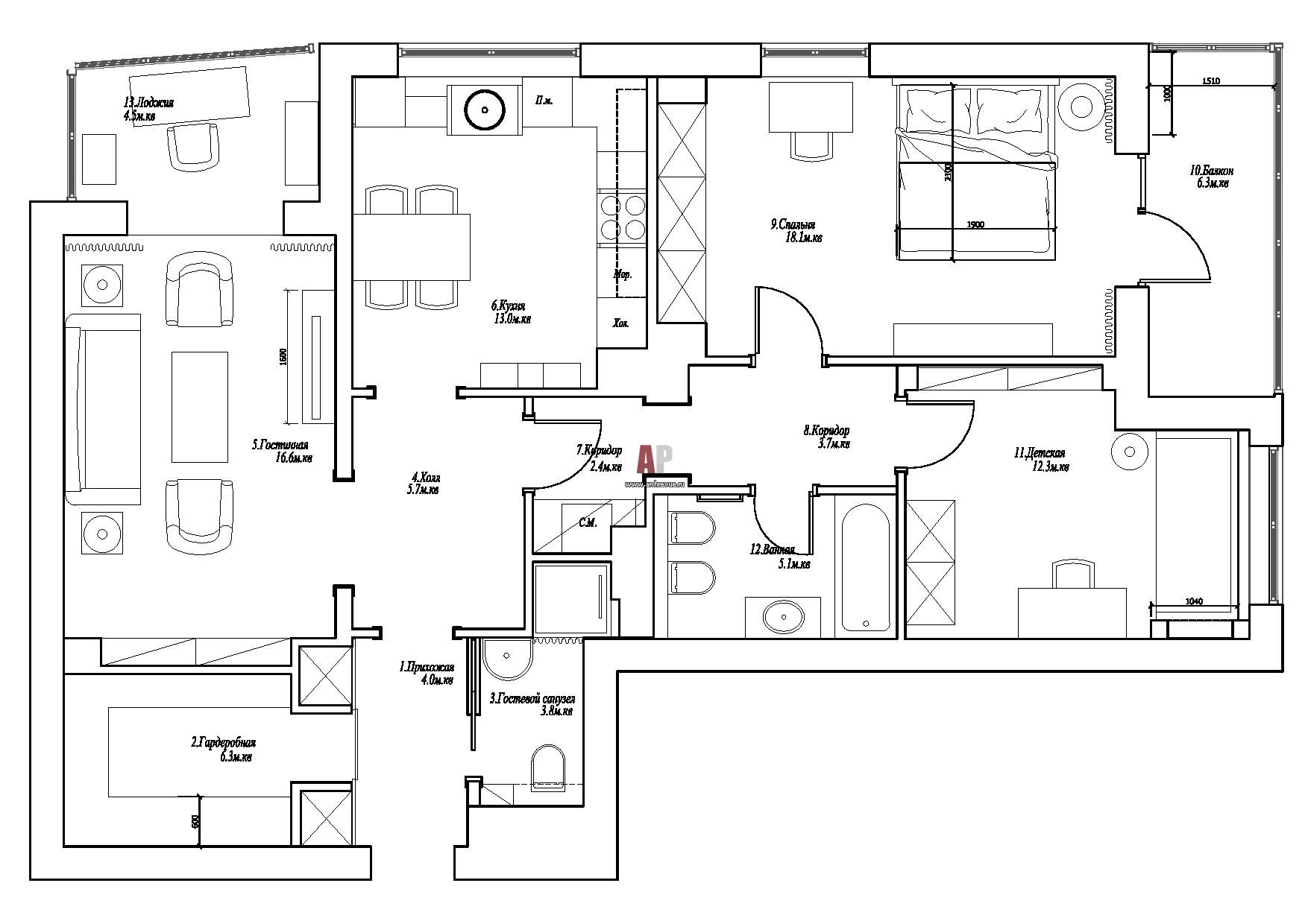 Планировка трехкомнатной квартиры площадью 105 кв. м с двумя лоджиями.