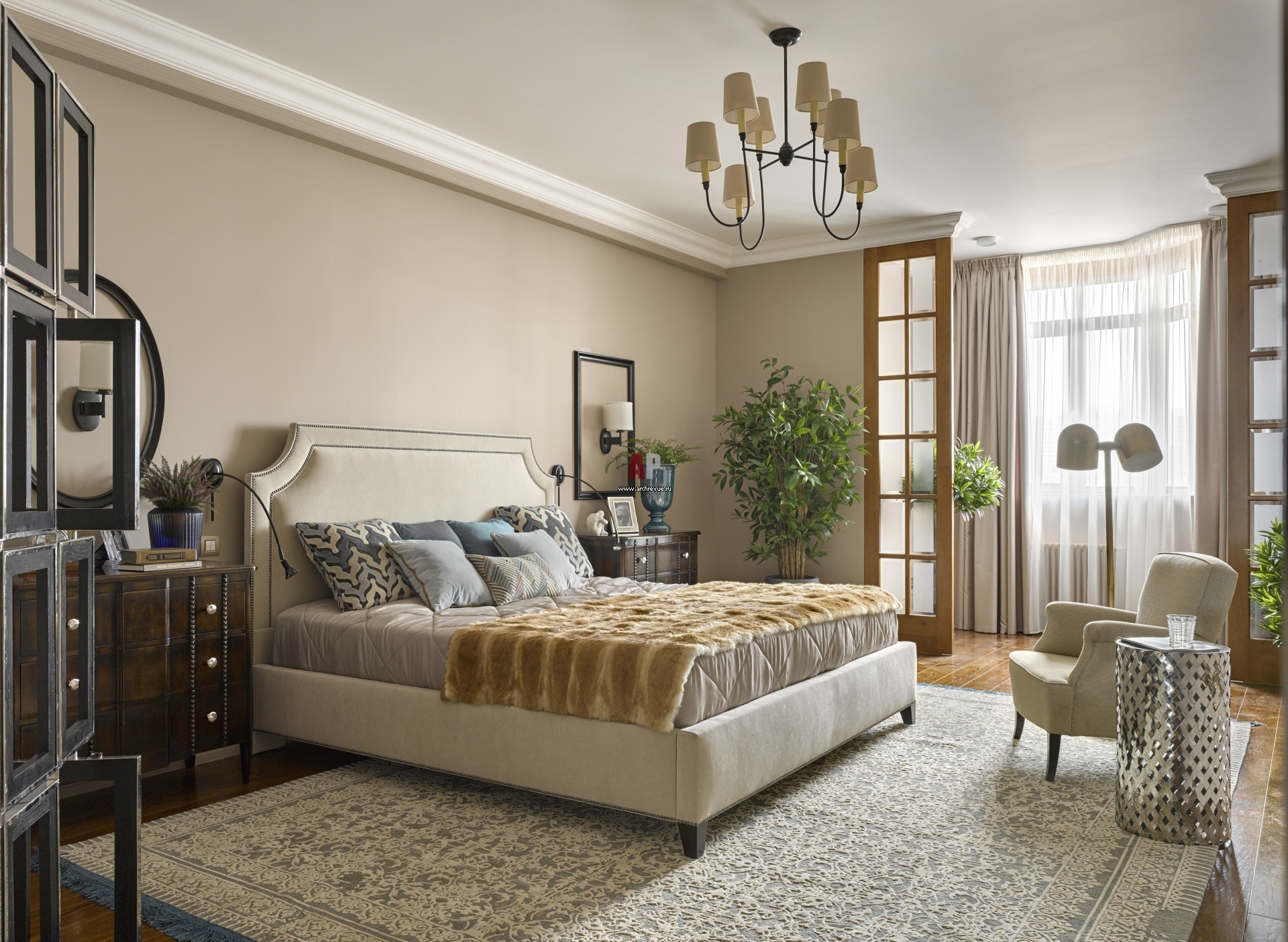 Интерьер спальни с элементами неоклассики и английского стиля. Эркер обрамляют высокие витражи с деревянными переплетами, они вносят в интерьер уют. Кровать, Vanguard Furniture. Тумбы, Selva. Аксессуары, Crate and Barrel.