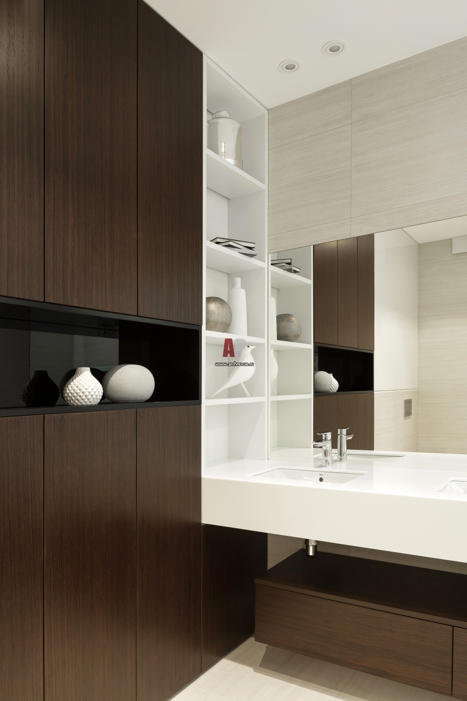 Система хранения в ванной комнате оформлена шпоном венге. Умывальник, Roca. Аксессуары, Vitra.