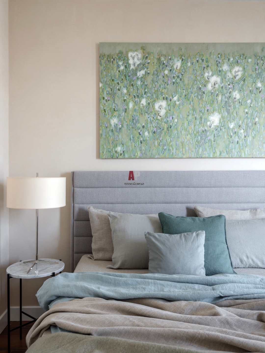 Интерьер спальни выполнен в спокойной серо-бежевой палитре с припыленными бирюзовыми акцентами. Изголовье кровати обтянуто серой тканью с ярко выраженной текстурой.