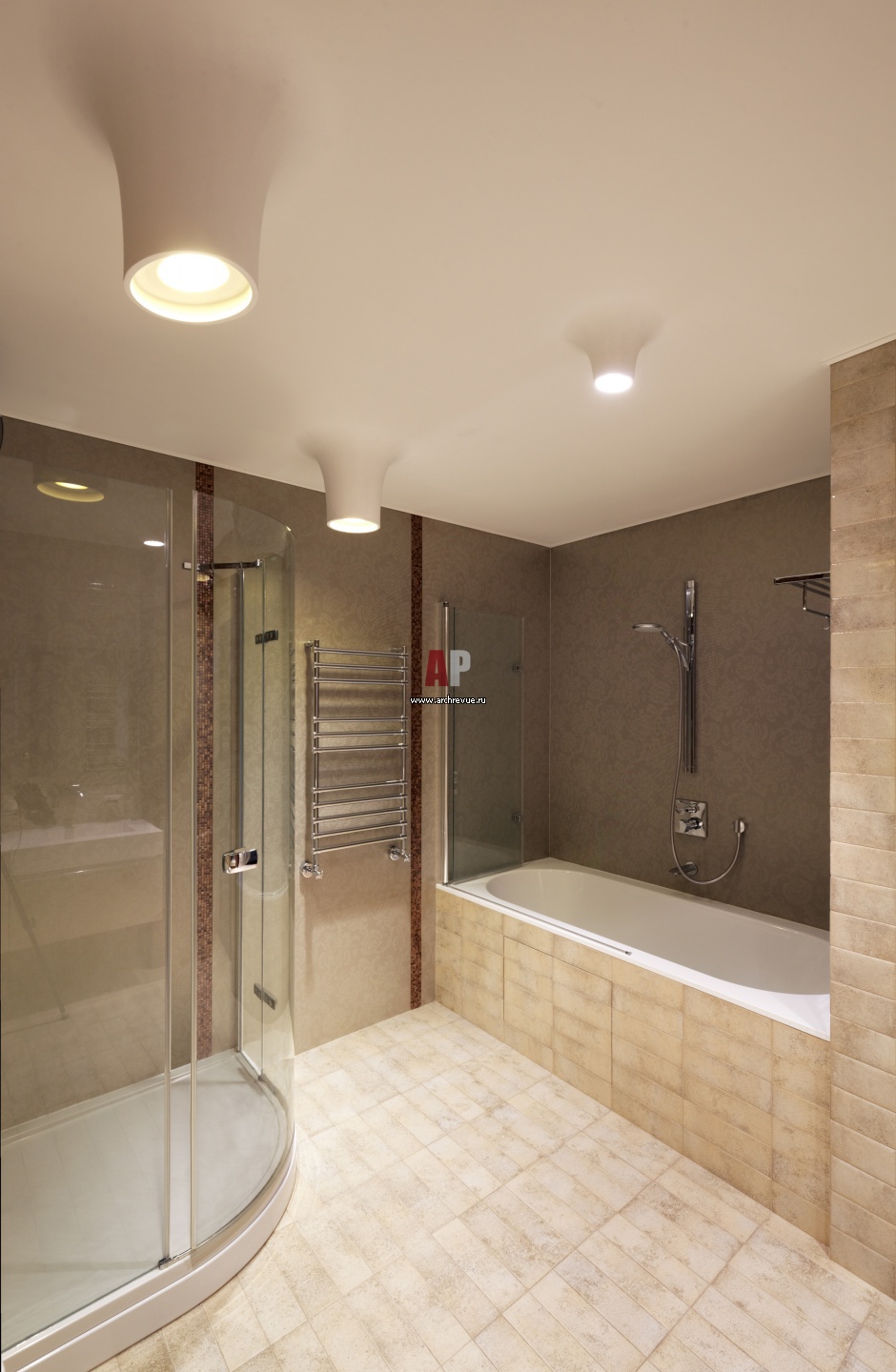 В интерьере ванной комнаты огромная плитка (размером 3000х1000 мм) в отделке стен сочетается с рулонным покрытием линкруста с классическим орнаментом.