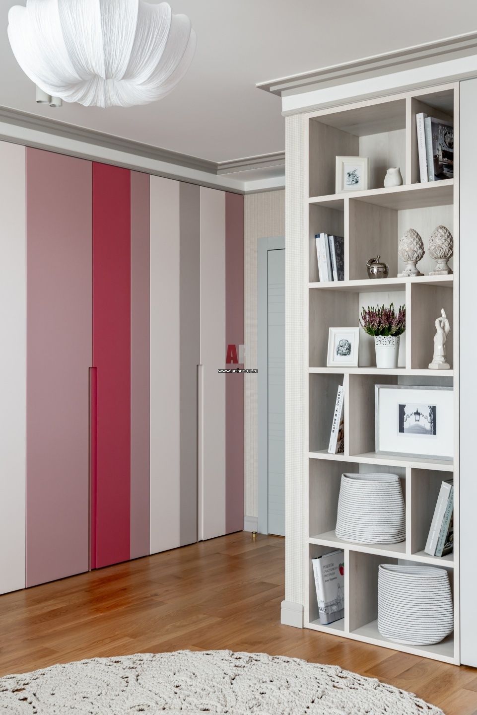 Интерьер детской в сиреневых и розовых тонах. Встроенный секционный шкаф с растяжкой по цвету сделан на заказ.