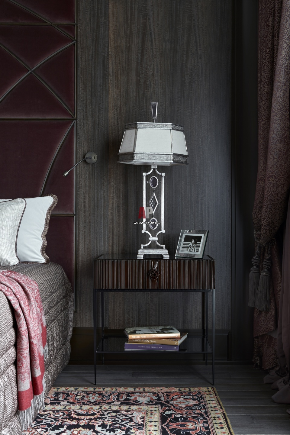 Интерьер спальни в духе американской классики. Настольная лампа, серебро, Fine Art Lamps.