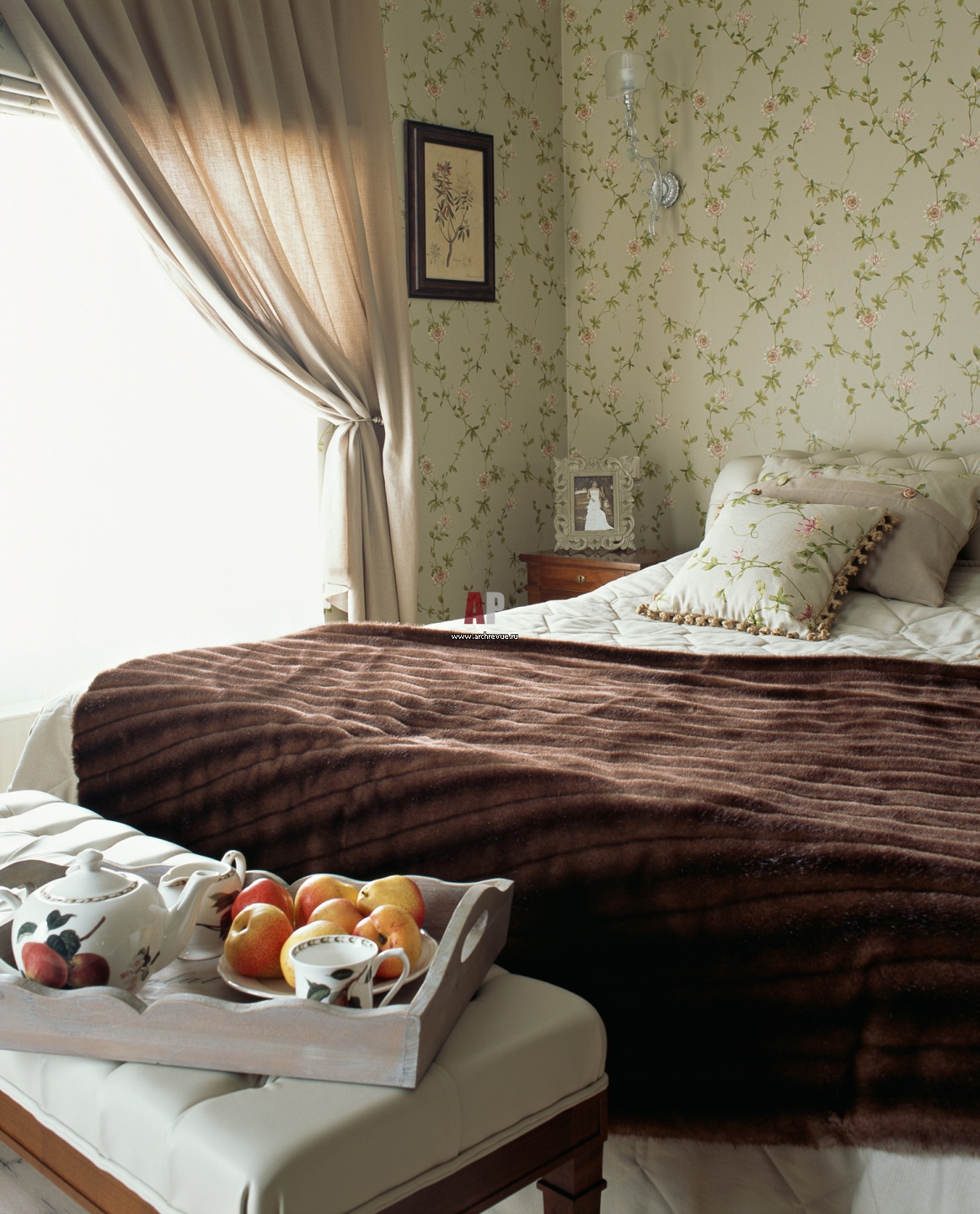 На стенах спальни – английские обои ручной работы Sanderson в мелкий цветочек.