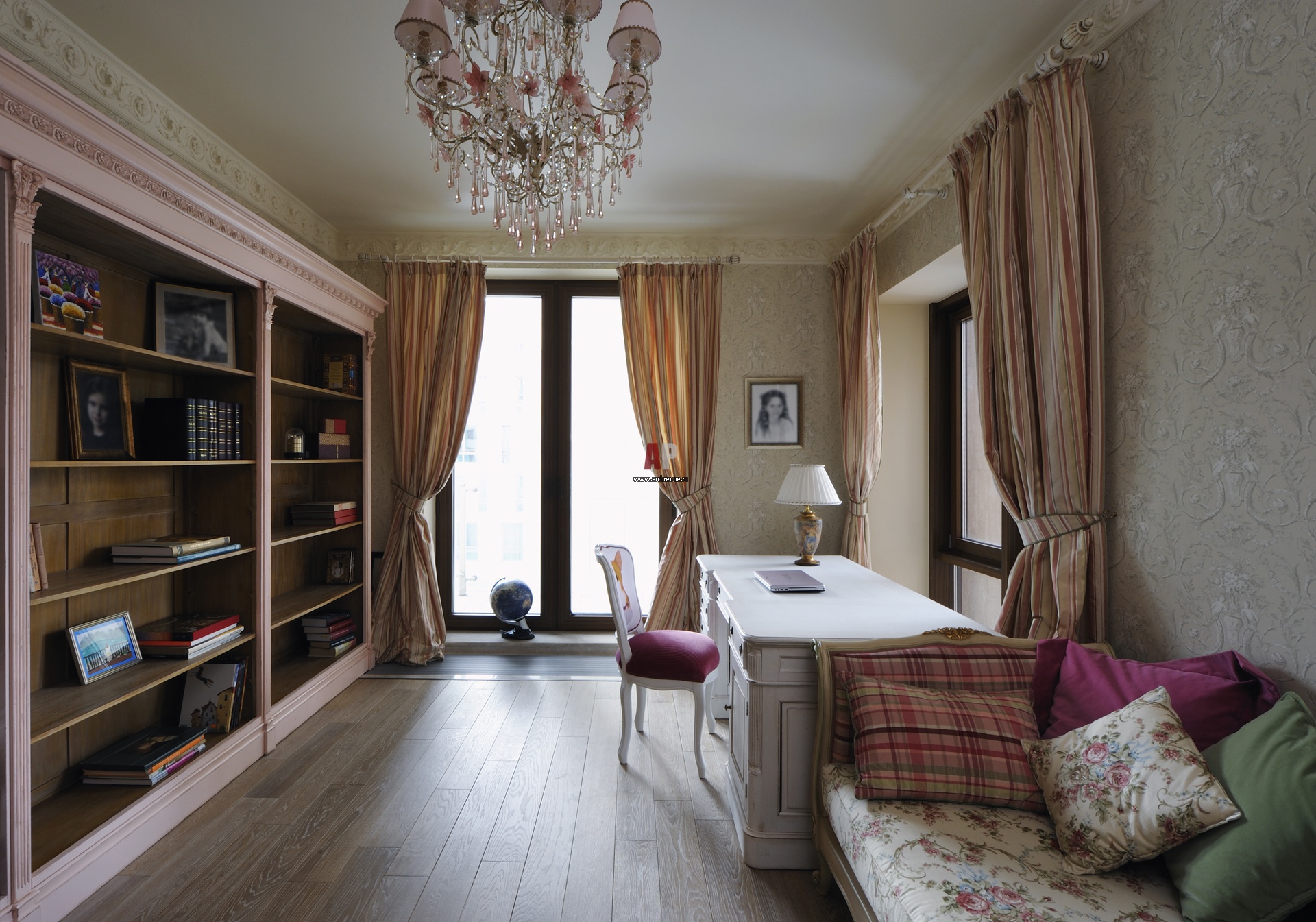 Второе помещение детской зоны – детский кабинет. В нем преобладают светлые тона с оттенками розового цвета. Просторное, светлое помещение с двумя окнами включает рабочую и библиотечную зону с кабинетным диваном. Изделия из дерева - поставщик «Столмастер»