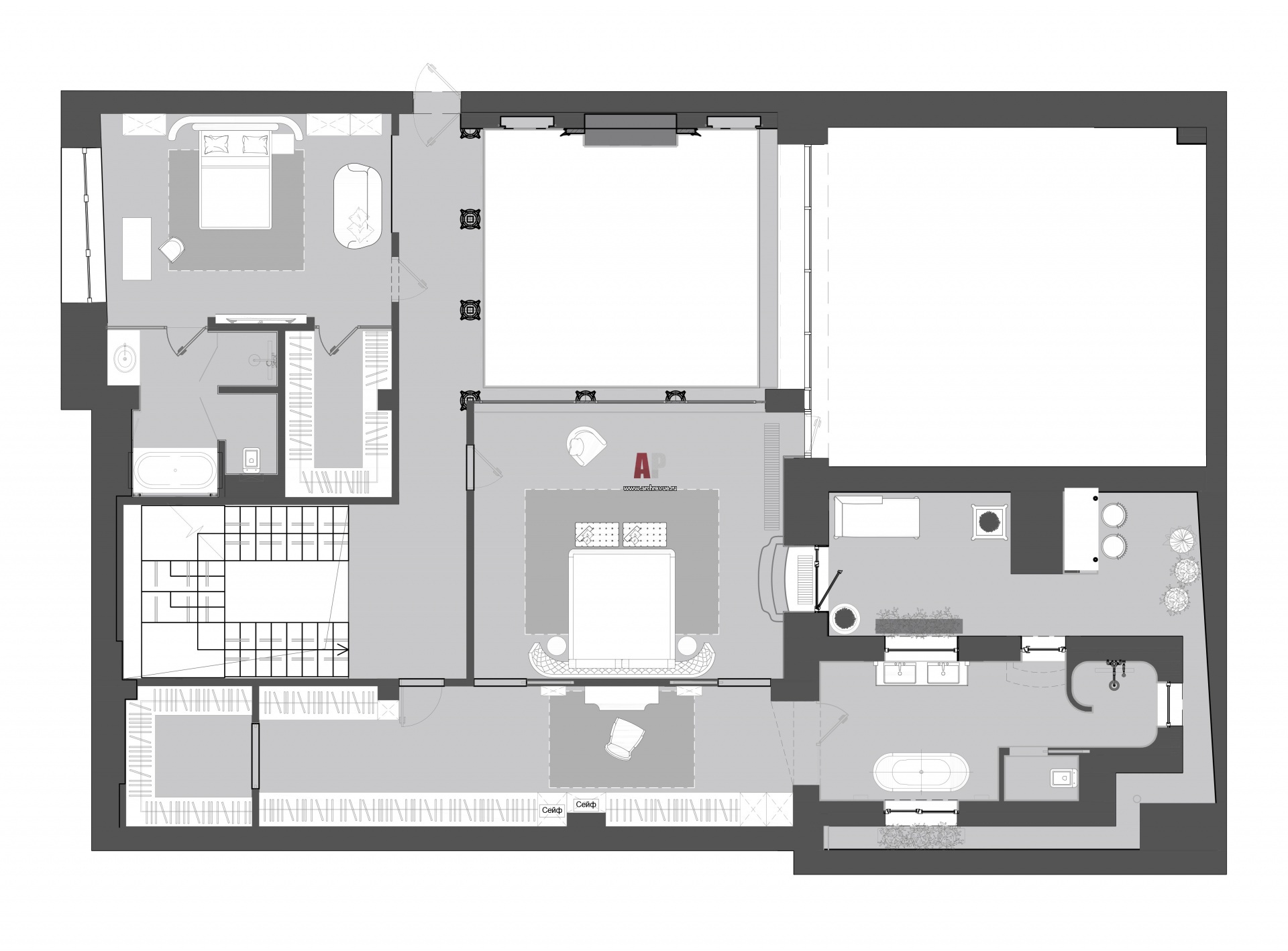 Планировка 2 этажа 2-х этажной квартиры с внутренним садом.
