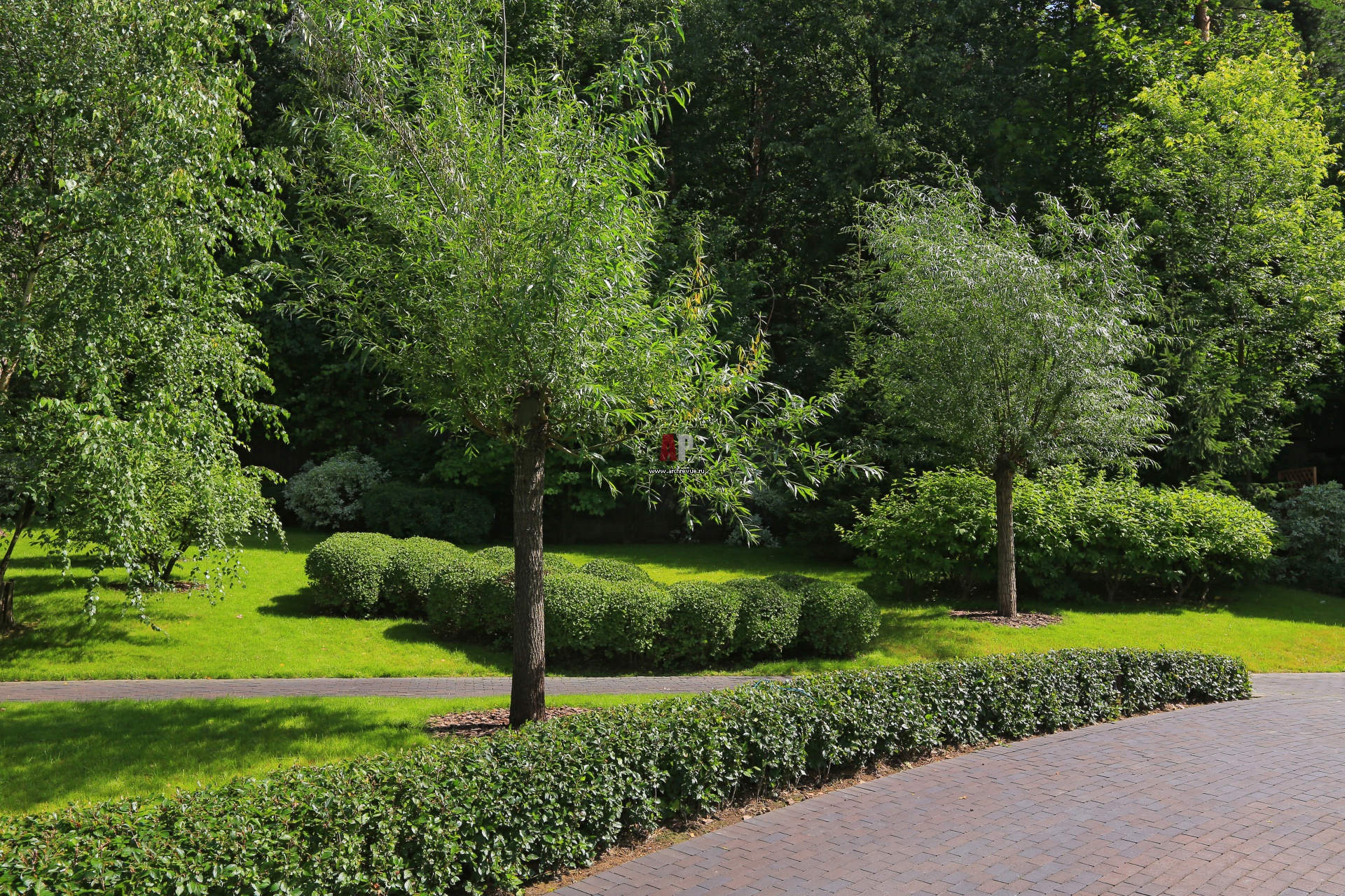 Вдоль дорожек с клинкерным мощением высажены скульптурные и топиарные кустарники.