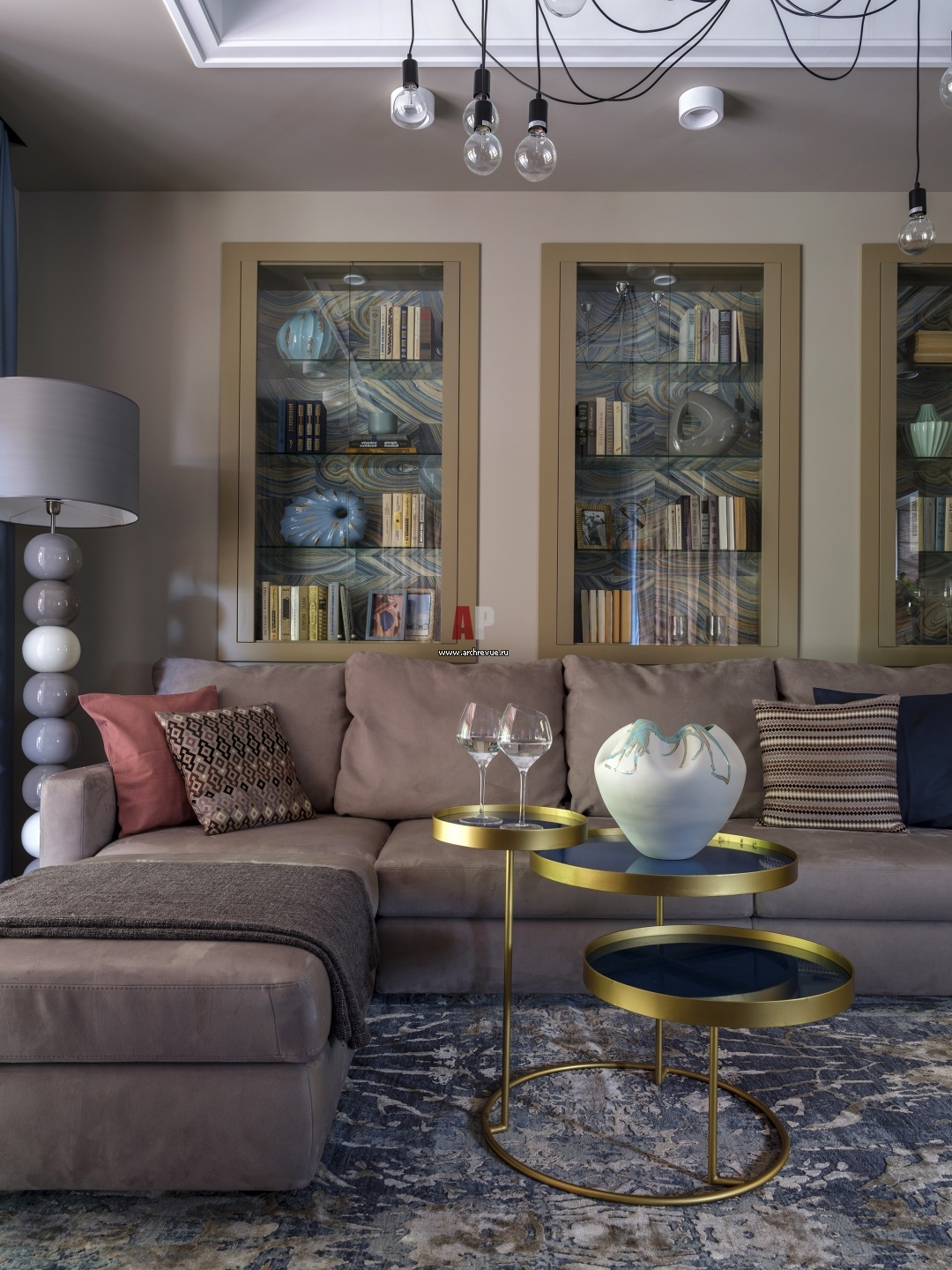 Загородный дуплекс в оттенках «розовый кварц» и «серенити». Зона отдыха со встроенной библиотекой в гостиной.