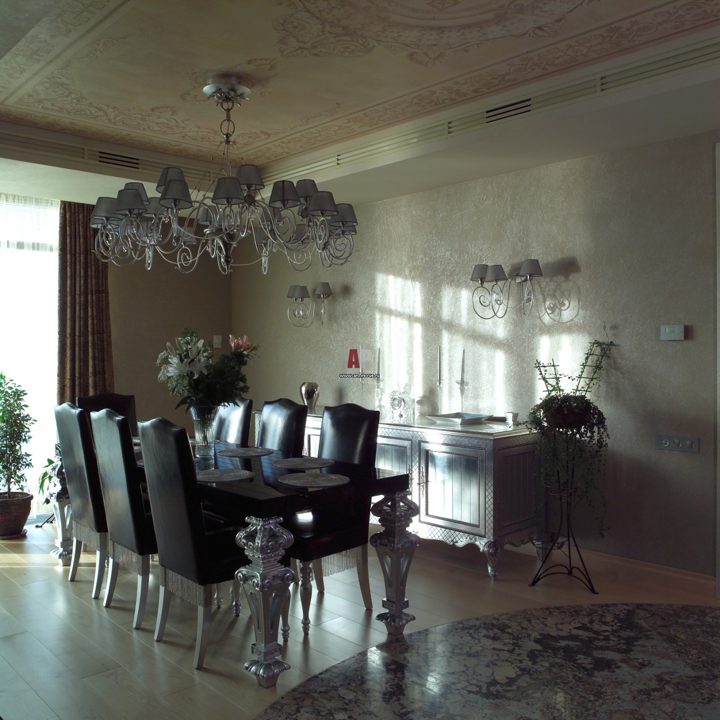 Парадная столовая выделена авторской фреской. Орнамент на потолке выполнен в классическом стиле и искусственно состарен. Художественные работы, компания «Студия Фрески».