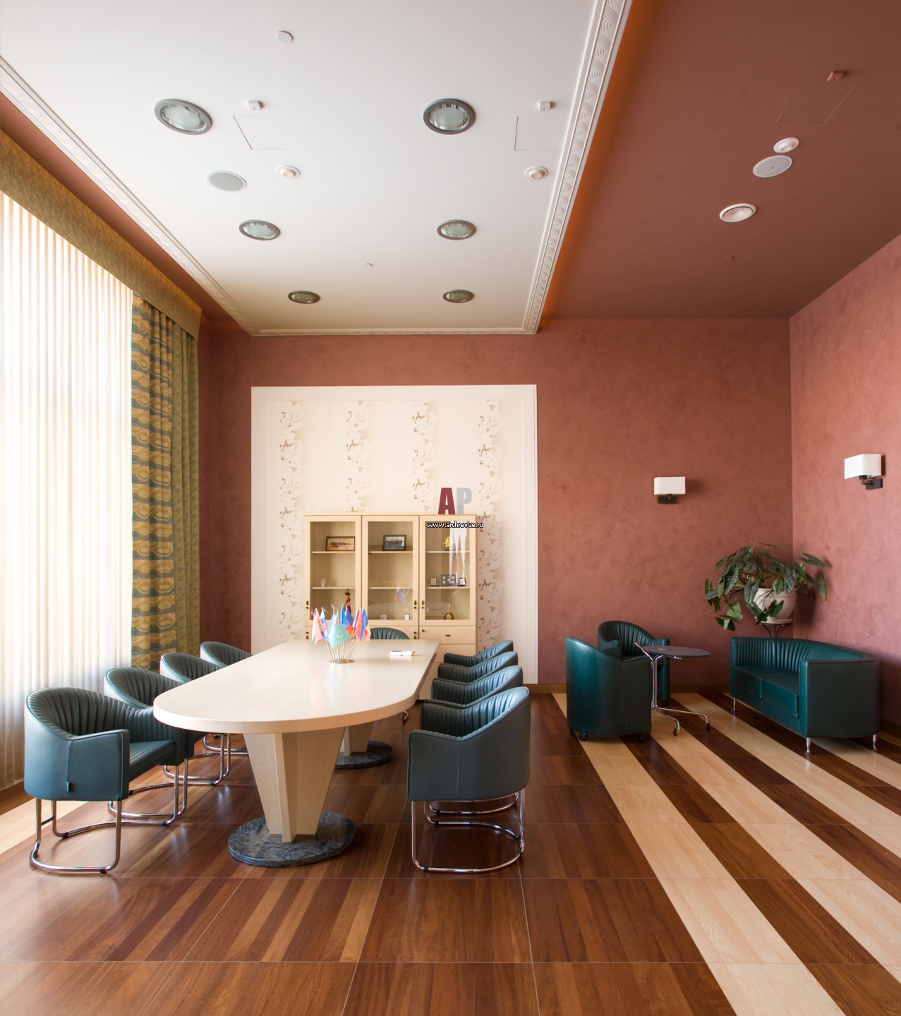 Кабинет руководителя исполнен в респектабельных материалах и отделках. Полы выполнены из дерева двух оттенков, поставщик Smart Company. Потолок и ниша оформлены лепным кантом, поставщик «Ампир Декор». В мебели i4Mariani угадываются черты сталинского ампира.