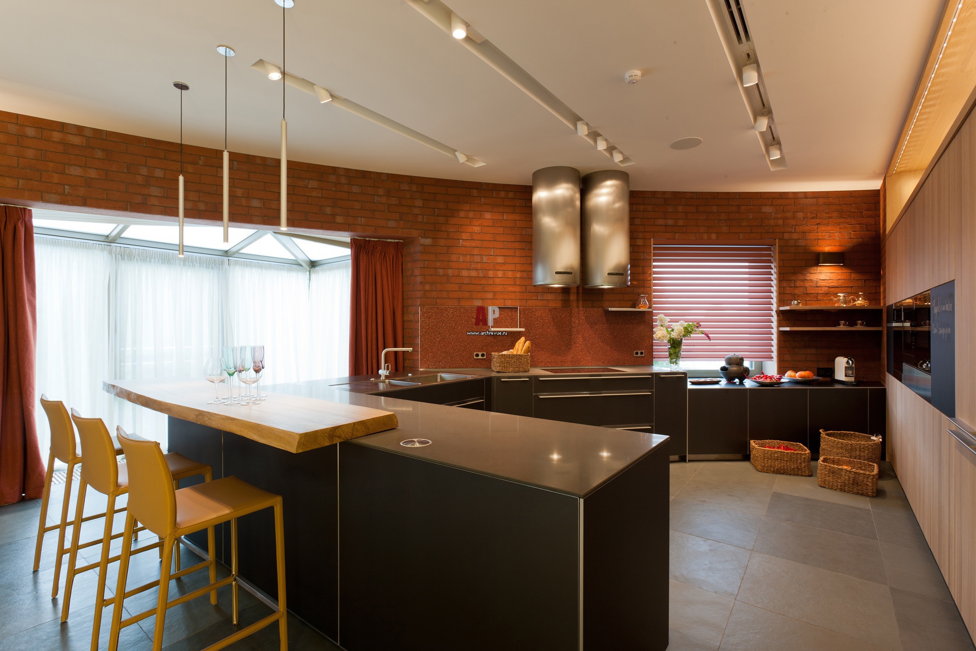На фото – кухня Bulthaup в современном интерьере. Фасады гарнитура выполнены из массива дуба. Барная столешница сделана на заказ из дубовой доски с неровной кромкой и трещинами. На полу – натуральный сланец. Лицевой керамический кирпич Terca, Wienerberger.