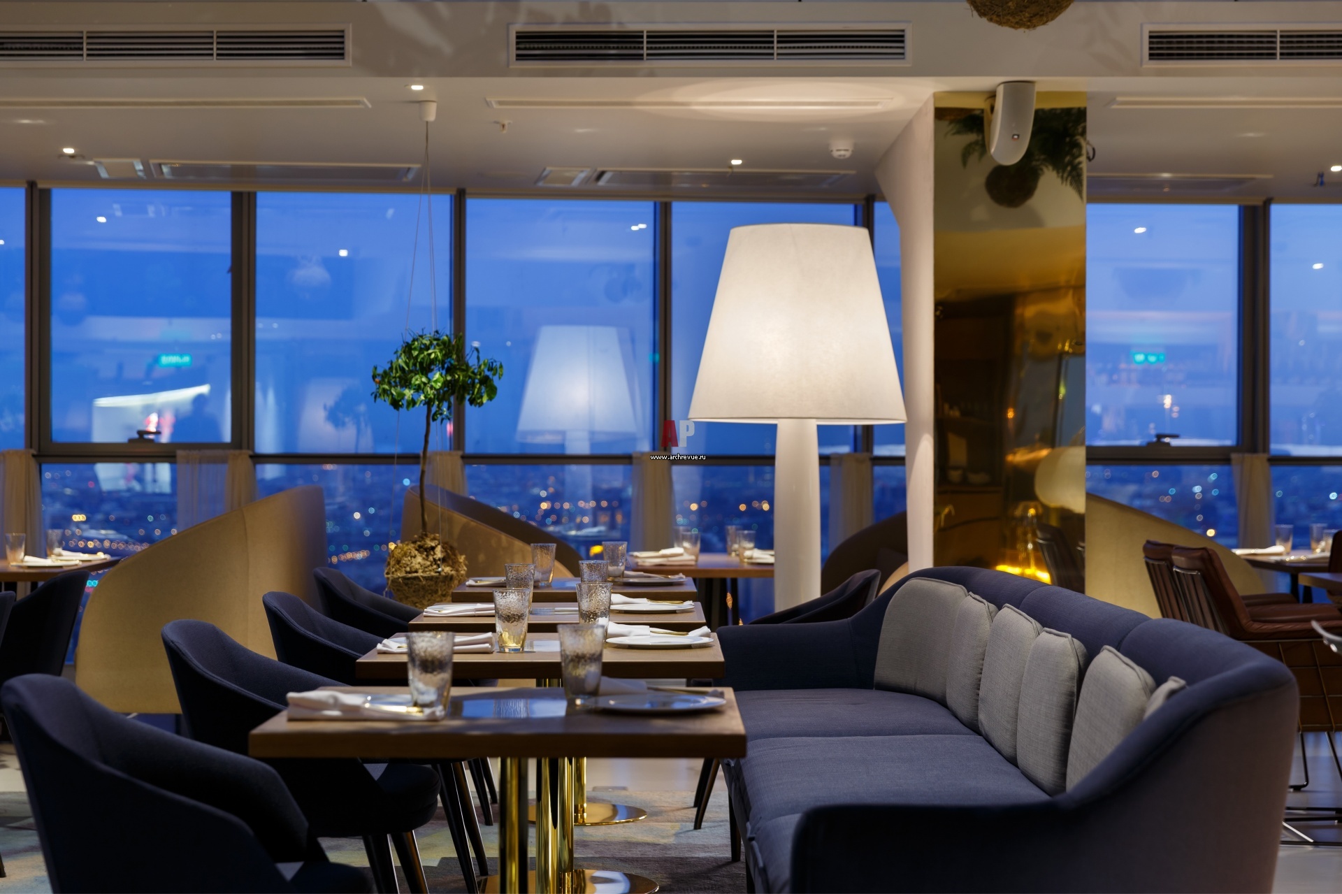 Интерьер зала панорамного ресторана «Этаж 41» при вечернем освещении.