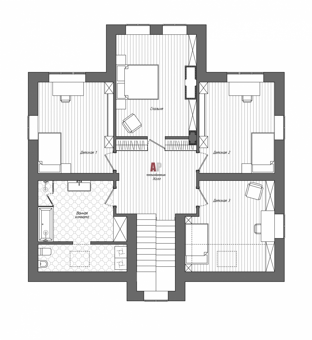 Планировка 2 этажа небольшого дома с камином.