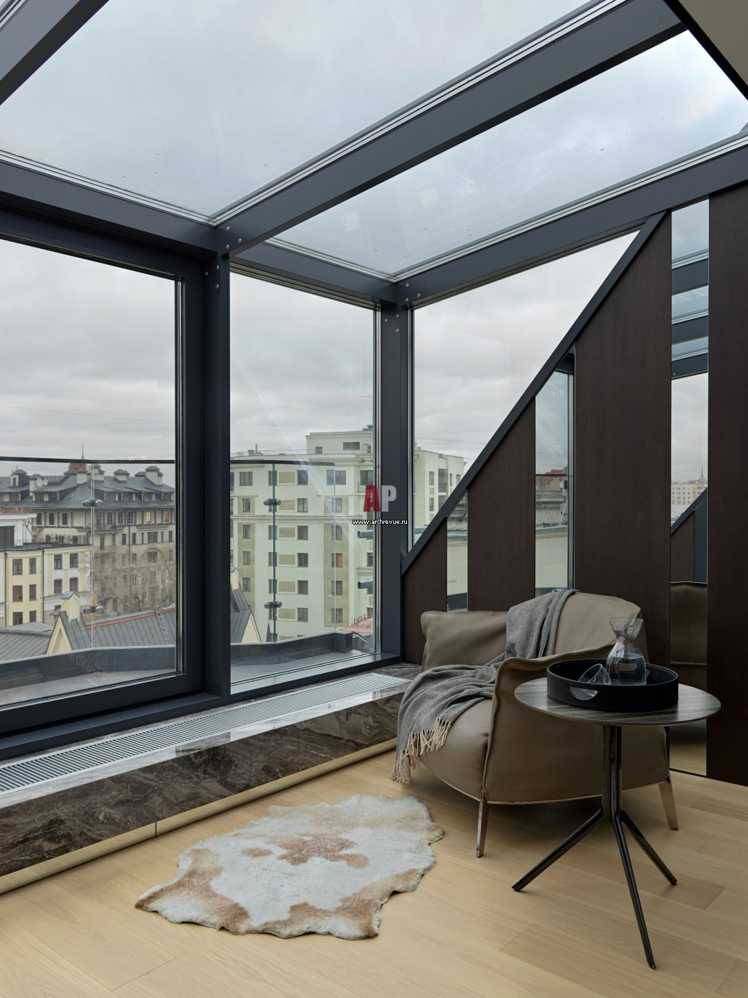В квартире две остекленные террасы с панорамным видом на город: при гостиной и при спальне.