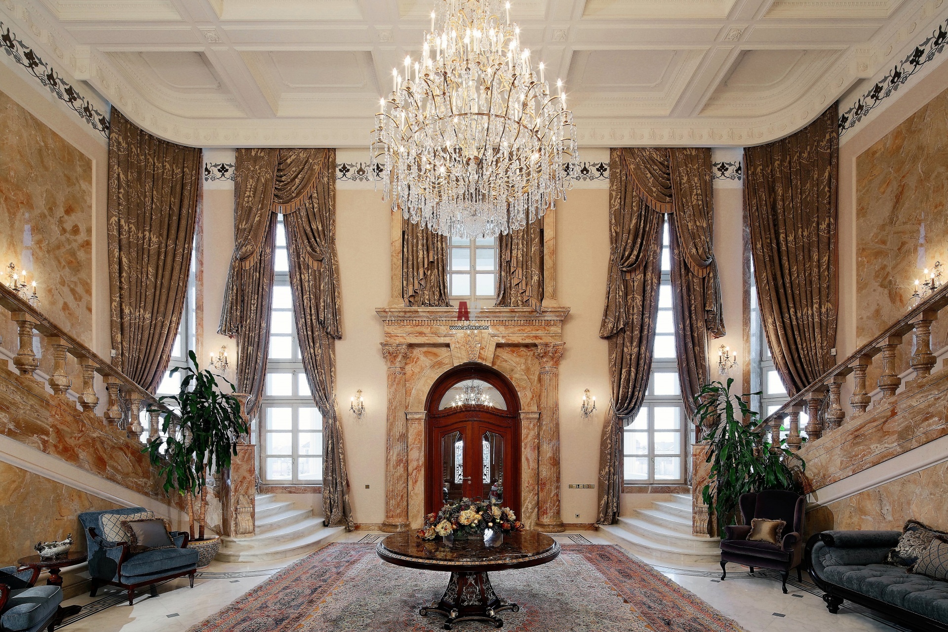Центральная зона в резиденции – парадный холл с мраморной двухмаршевой лестницей, он создает торжественный настрой.