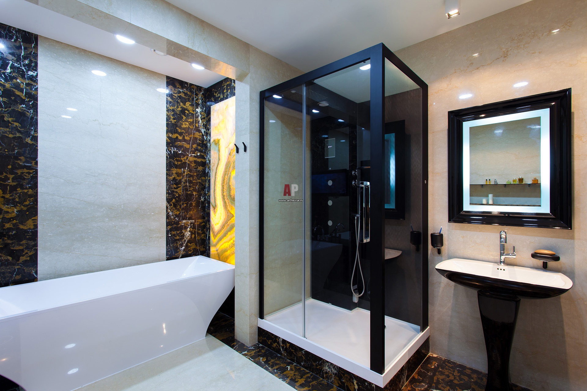 На фото – ванная комната, которая благодаря слэбам натурального камня (мрамора, оникса), черной керамике и оригинальной сантехнике выглядит парадно.