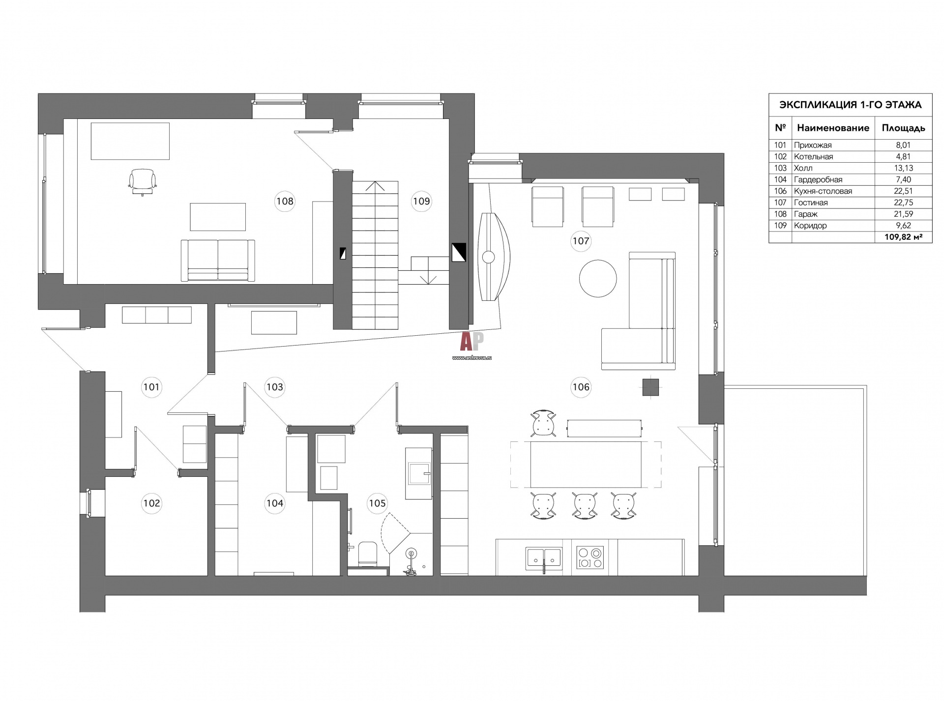 План 1 этажа 2-х этажного таунхауса.