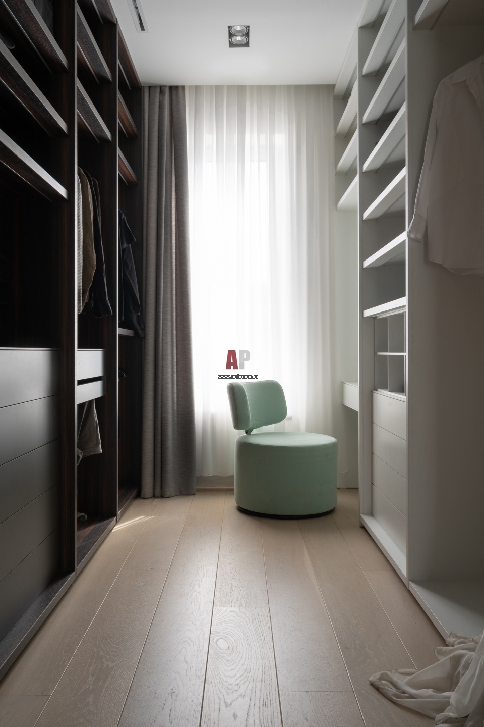Современный дом с бассейном в Ростовской области. Интерьер гардеробной при спальне.