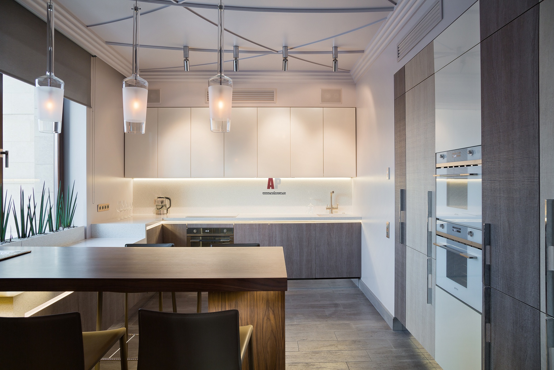 На фото – интерьер кухни в минимализме. Пространство кухни решено архитектурно. Вертикальные системы хранения маркированы в разные оттенки серого, навесные полки решены в белом глянце.