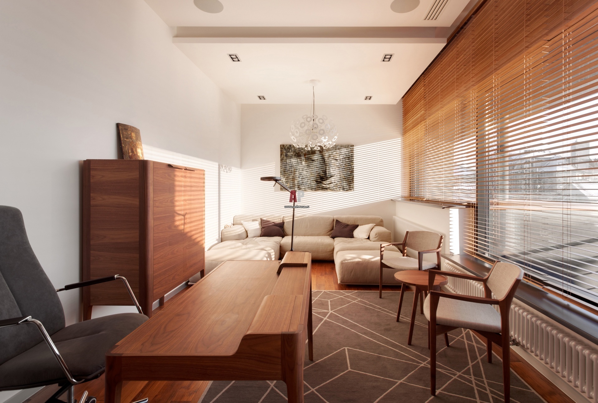 Интерьер кабинета в современном доме. Натуральный насыщенный оттенок половой доски из массива тика и предметов мебели, а также деревянные жалюзи вносят интригу в спокойное по оформлению помещение.