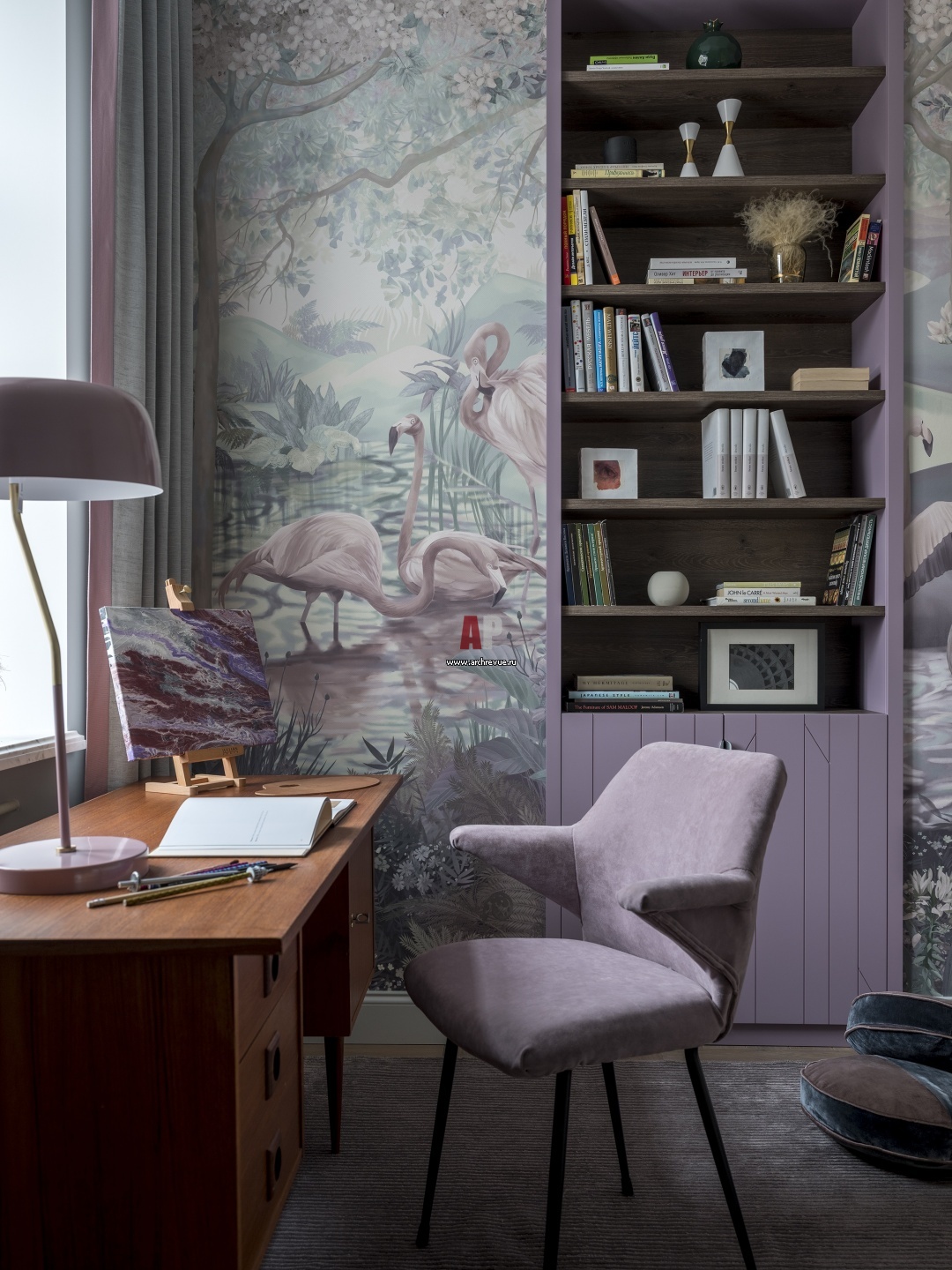 Интерьер детской в припыленных сиреневых тонах с обоями, имитирующими фреску.