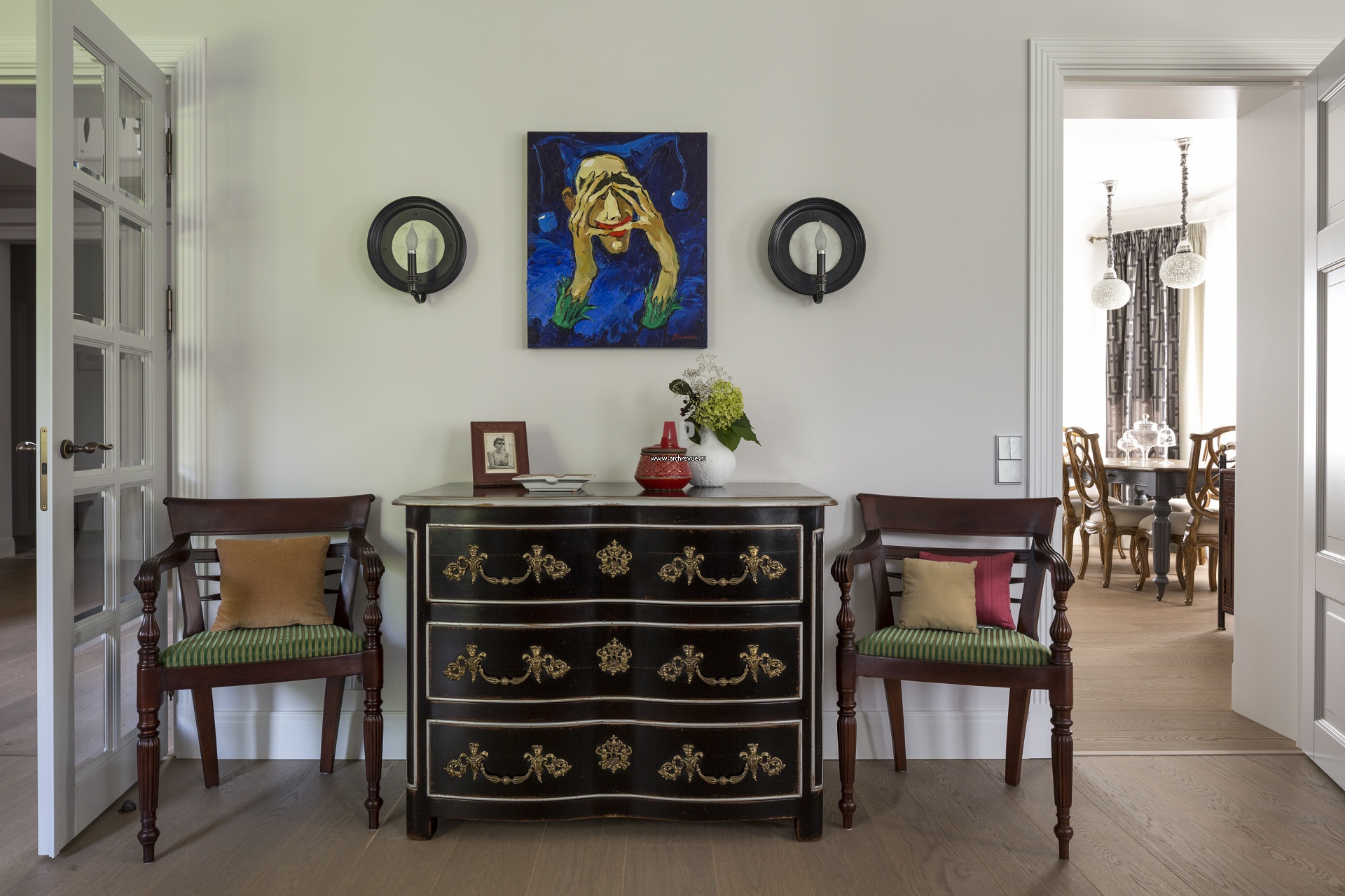 Холл первого этажа. В отделке интерьера дома использовано 15 оттенков серого цвета. Они служат фоном для мебели, подобранной в индивидуальном порядке или оставшейся от предыдущего интерьера.