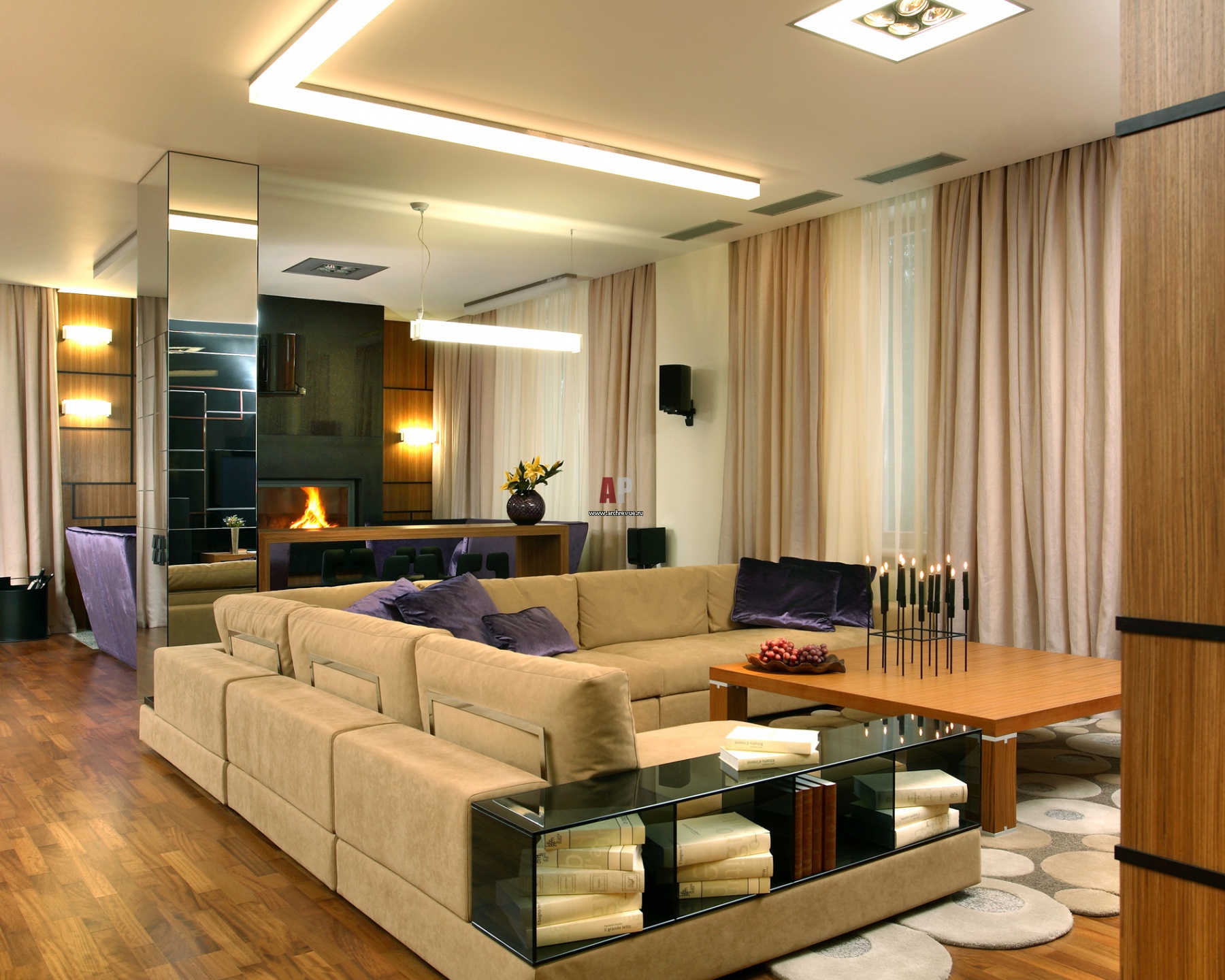 В гостиной за «Г»-образным диваном расположена зона камина. Топка камина, поставщик «Интерьерный салон» («Loki камины»), облицована черным полированным гранитом. Фиолетовые диваны возле камина с нестандартно высокими спинками (1,20 м).