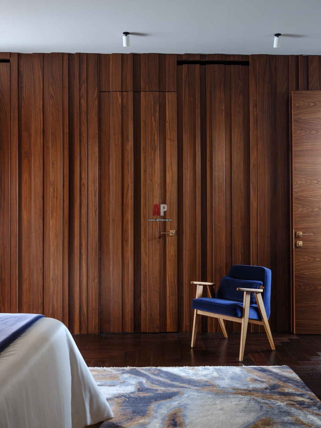Дверь из спальни в гардеробную исполнена как часть композиции из стеновых панелей. Панели в виде реек разной ширины выполнены из ореха. Синее кресло, Gubi.