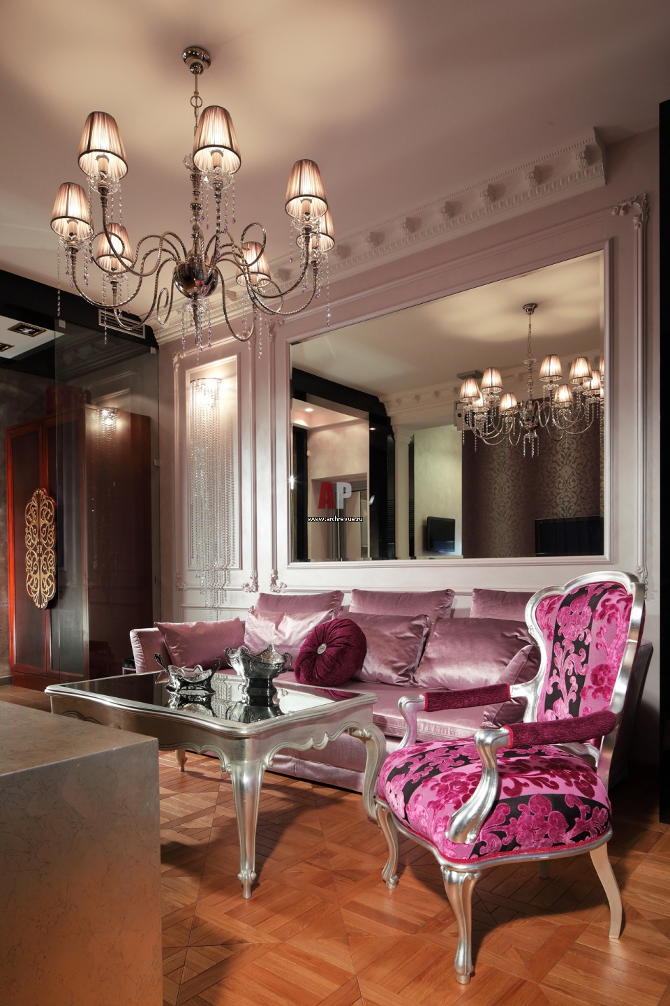 Фото интерьер эклектичной квартиры с приметами классики, необарокко и минимализма. Сиреневое с серебром кресло досталось хозяйки от прабабушки, оно было отреставрировано и переобтянуто.