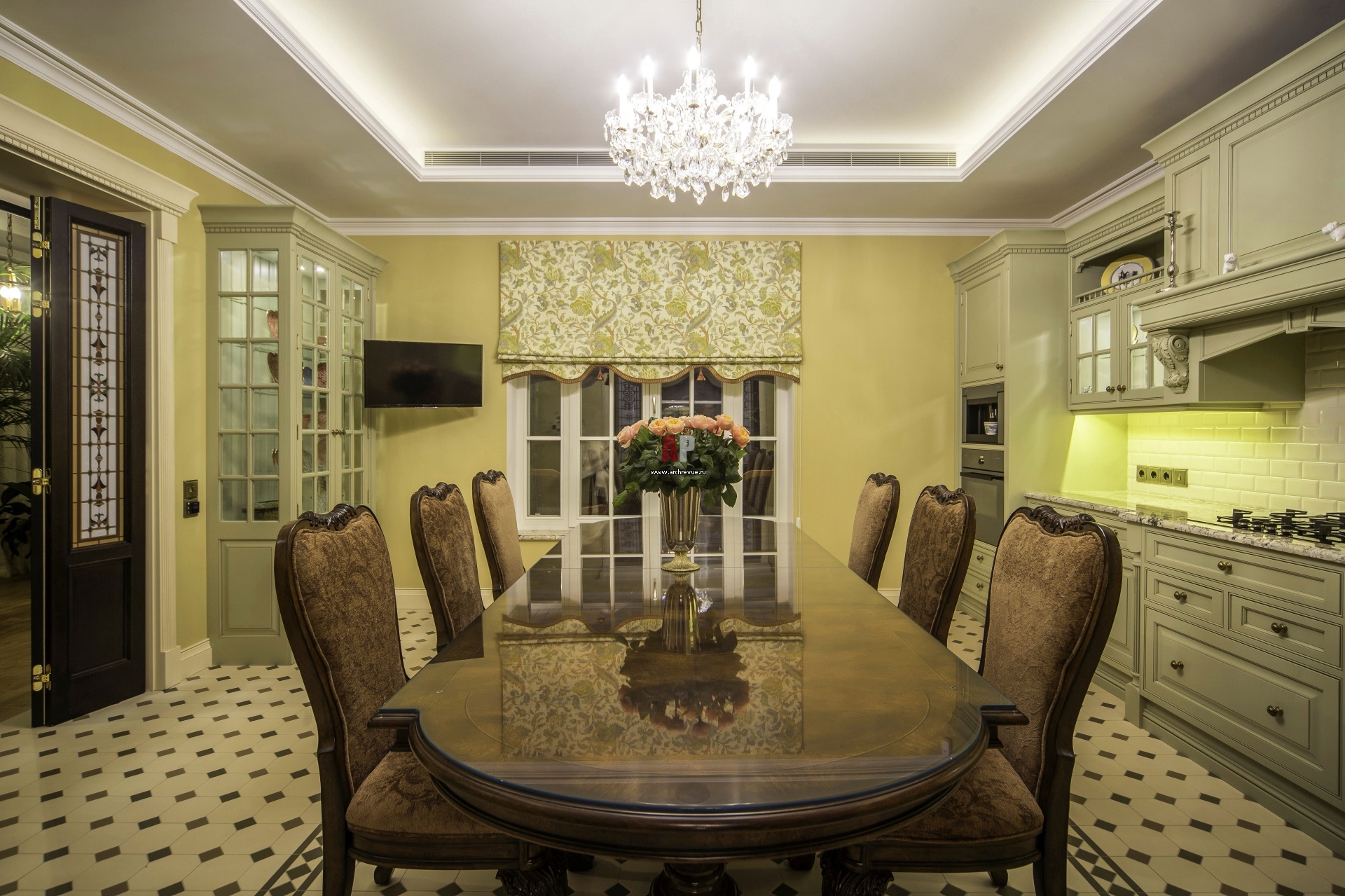Интерьер кухни-столовой дома в традиционном английском классическом стиле.