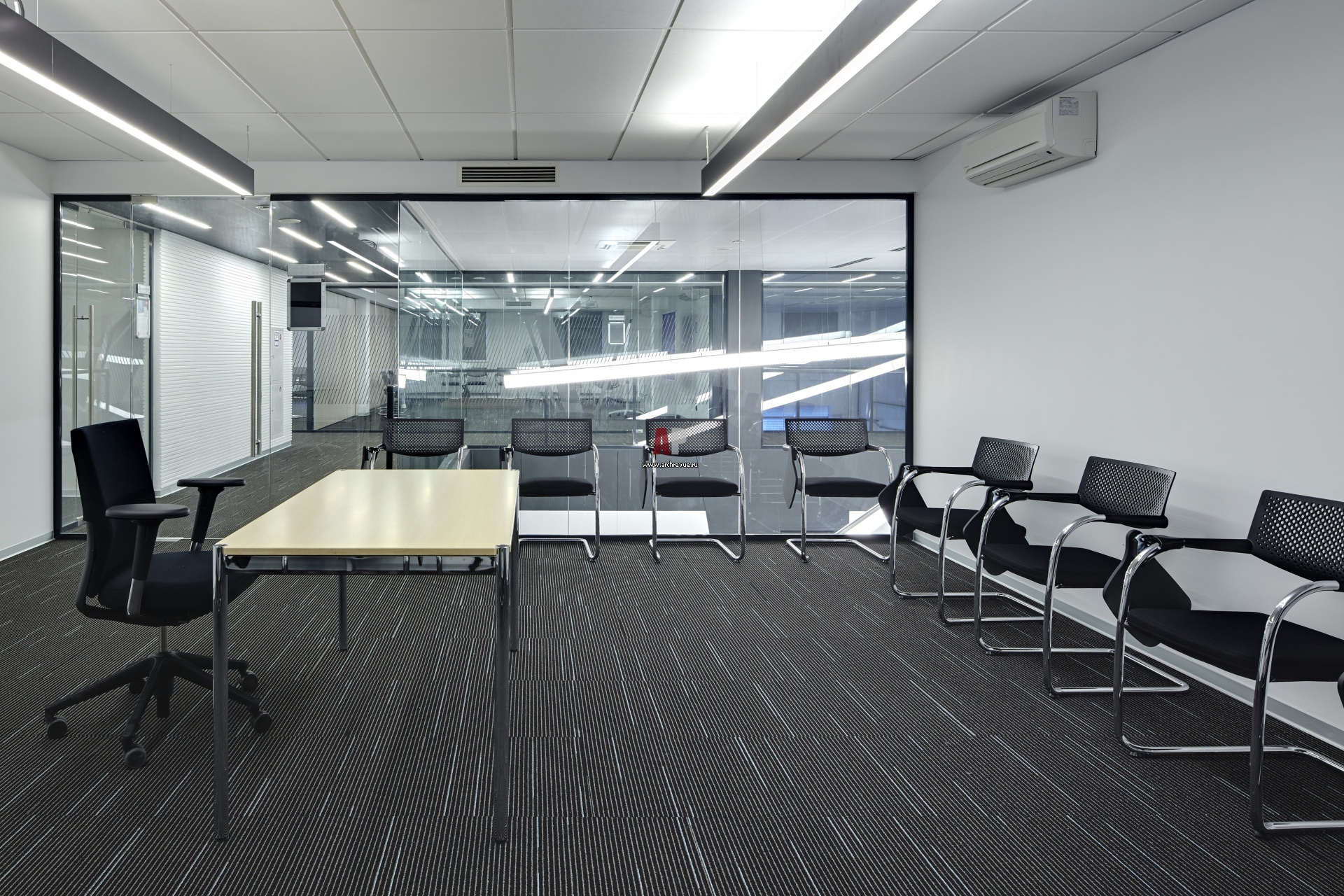 Фото интерьера переговорной обучающего центра Volkswagen. На полу – темно-серая ковровая плитка, она обеспечивает доступ к коммуникациям, которые проходят по полу.