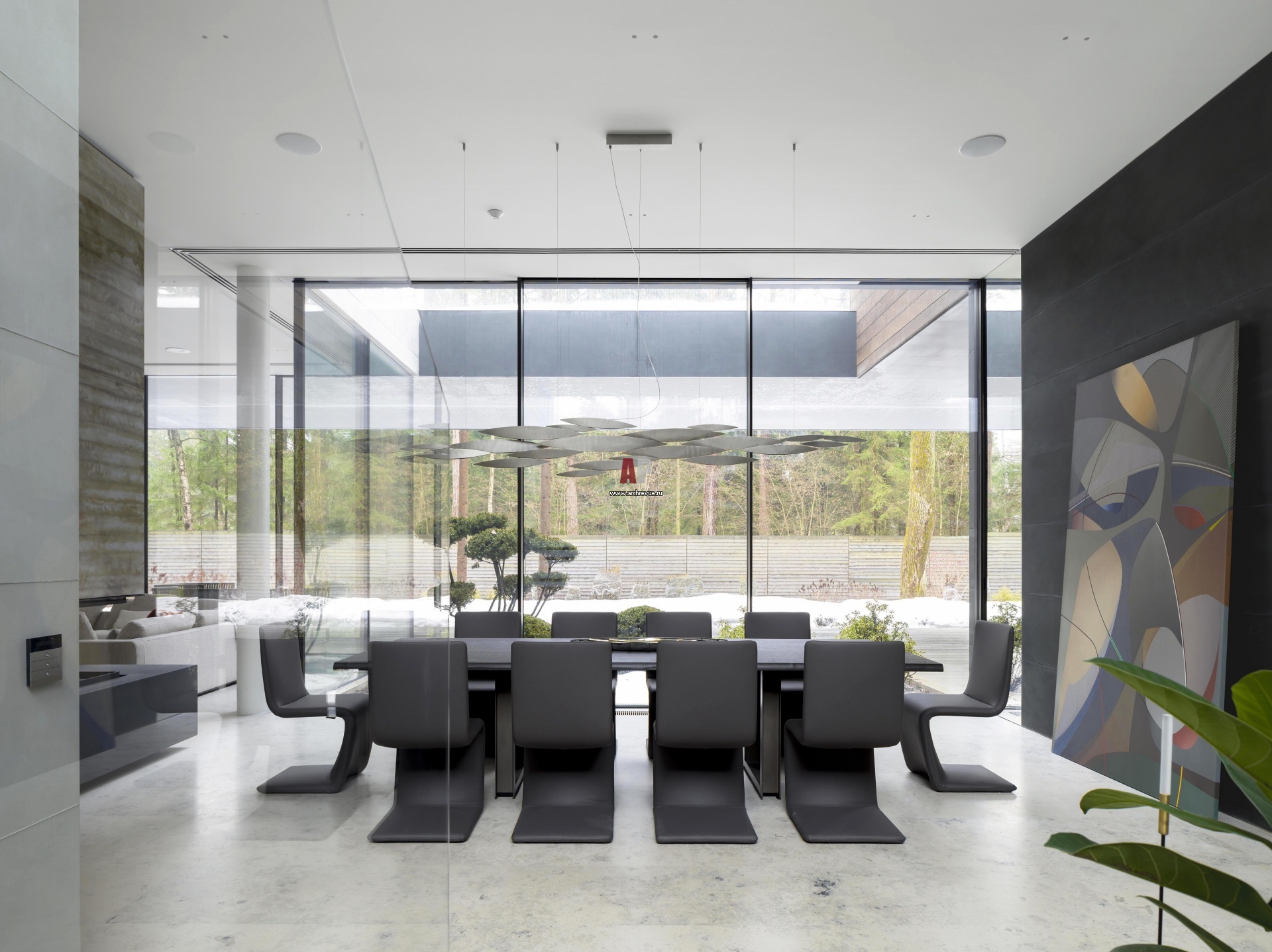 Столовая группа. Раздвижные окна-стены ведут на открытую террасу. На полу – известняк, таким же отделаны фасады дома.